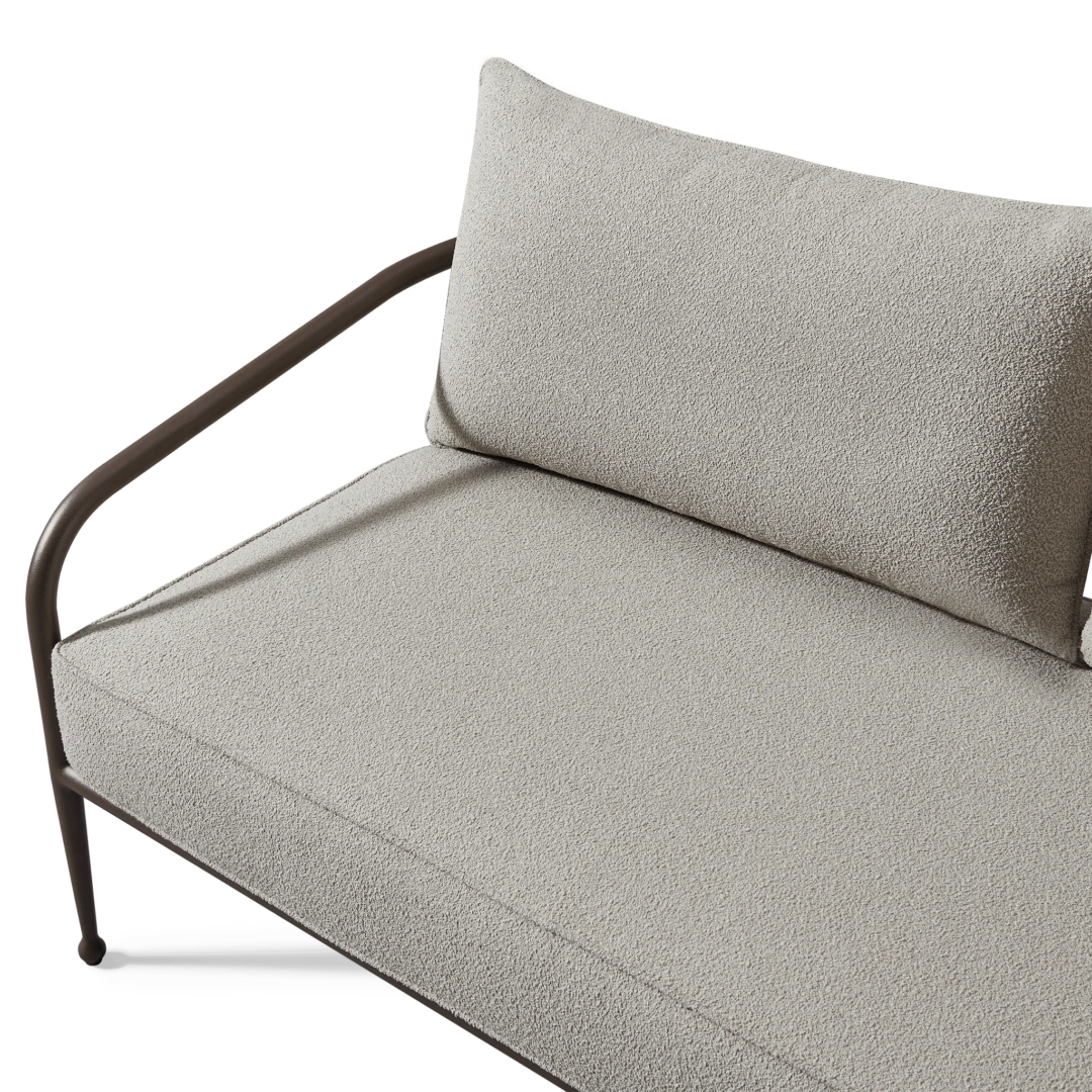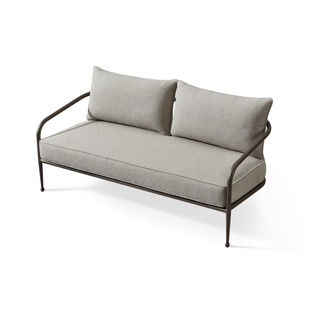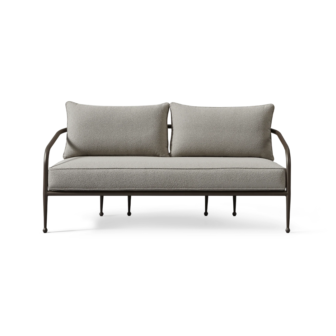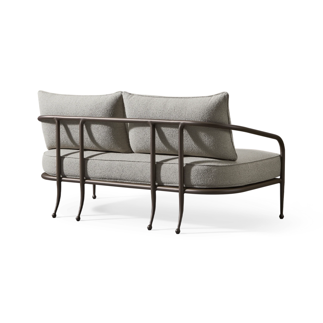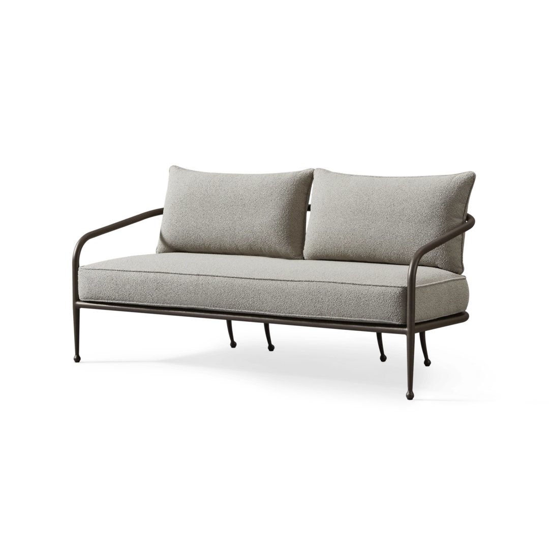 The Andre 2 Seat Sofa is inspired by classic wrought iron European furniture—enjoy a comfortable bench seat cushion with a pair of back pillows on our signature powder coated Aluminium frame in a thinner style that creates an airy openness. The gradual slope and subtle curve of the frame add contemporary flair, while the back legs echo this effect with an equally subtle splay design. Details like ball feet and multiple rows of legs inject a contemporary, playful element. Petite in scale but grande in design, this outdoor sofa captures the look and feel of iron in an elegant construction that you might discover sitting in the garden of a five–star hotel in the South of France.
