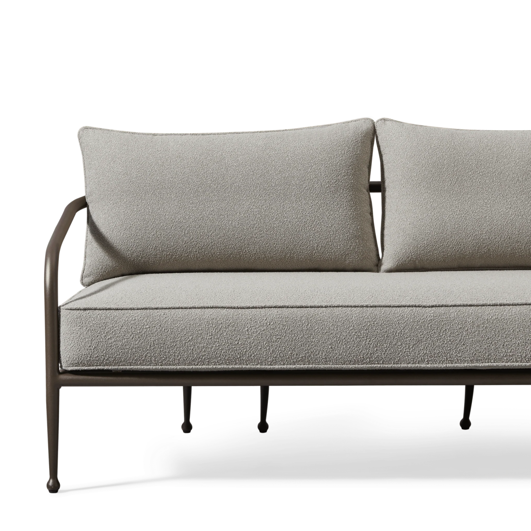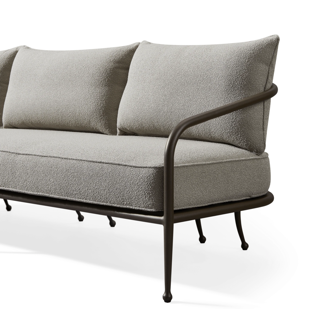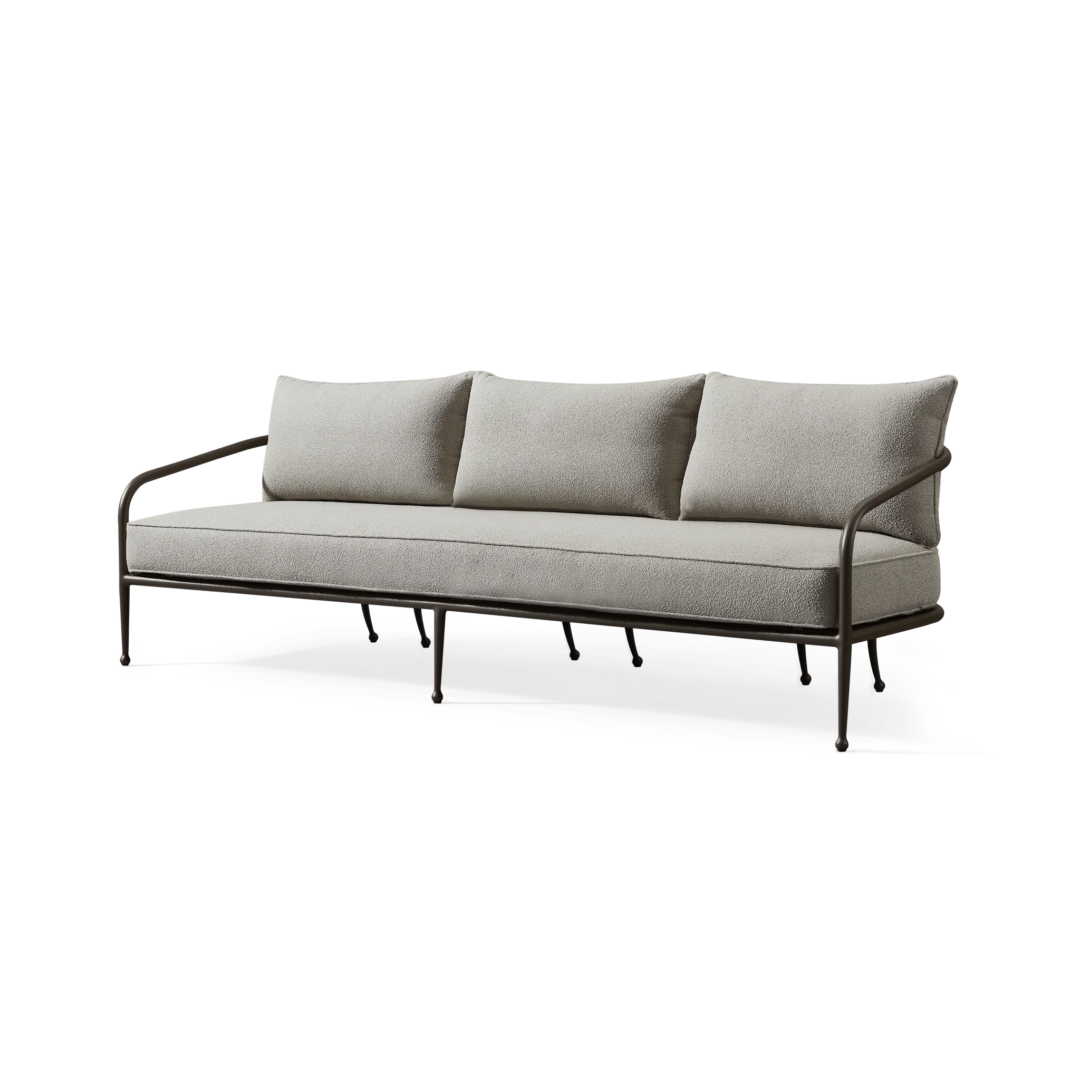 The Andre 3 Seat Sofa is inspired by classic wrought iron European furniture—enjoy a comfortable bench seat cushion with a trio of back pillows on our signature powder coated Aluminium frame in a thinner style that creates an airy openness. The gradual slope and subtle curve of the frame add contemporary flair, while the back legs echo this effect with an equally subtle splay design. Details like ball feet and multiple rows of legs inject a contemporary, playful element. Petite in scale but grande in design, this outdoor sofa captures the look and feel of iron in an elegant construction that you might discover sitting in the garden of a five–star hotel in the South of France.