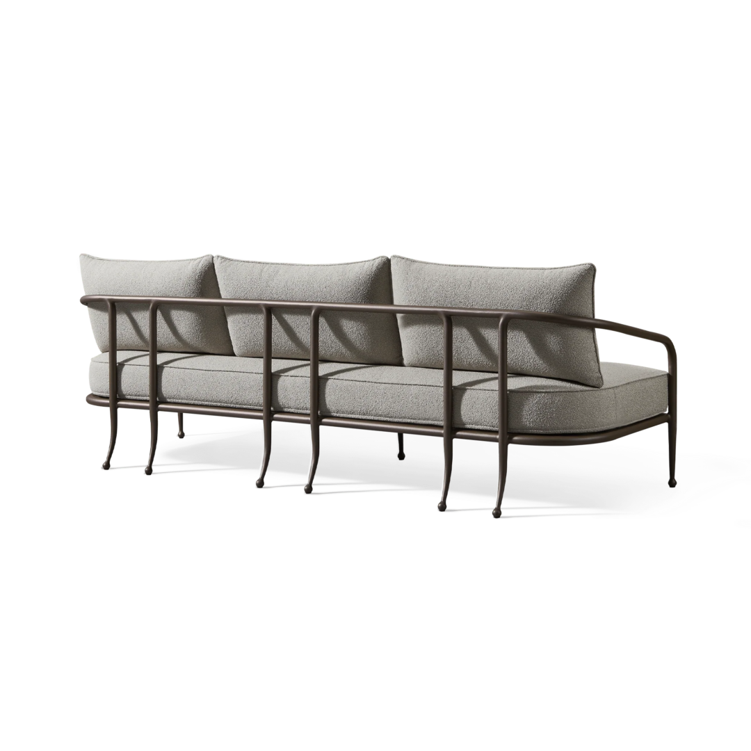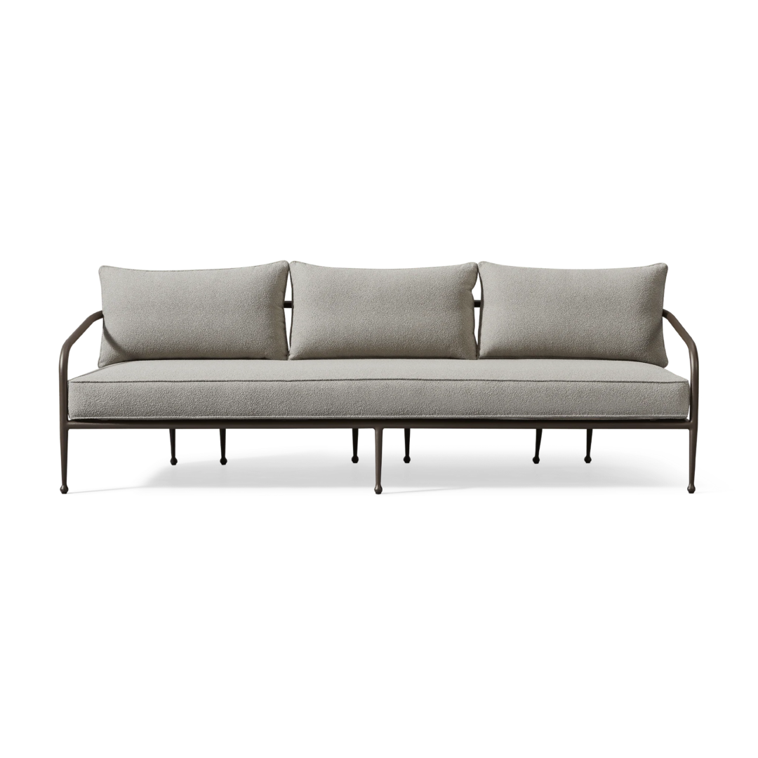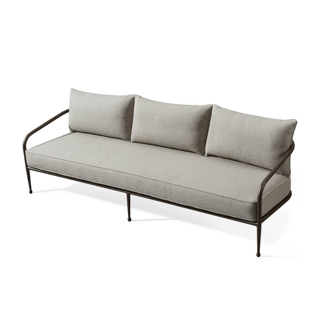 The Andre 3 Seat Sofa is inspired by classic wrought iron European furniture—enjoy a comfortable bench seat cushion with a trio of back pillows on our signature powder coated Aluminium frame in a thinner style that creates an airy openness. The gradual slope and subtle curve of the frame add contemporary flair, while the back legs echo this effect with an equally subtle splay design. Details like ball feet and multiple rows of legs inject a contemporary, playful element. Petite in scale but grande in design, this outdoor sofa captures the look and feel of iron in an elegant construction that you might discover sitting in the garden of a five–star hotel in the South of France.