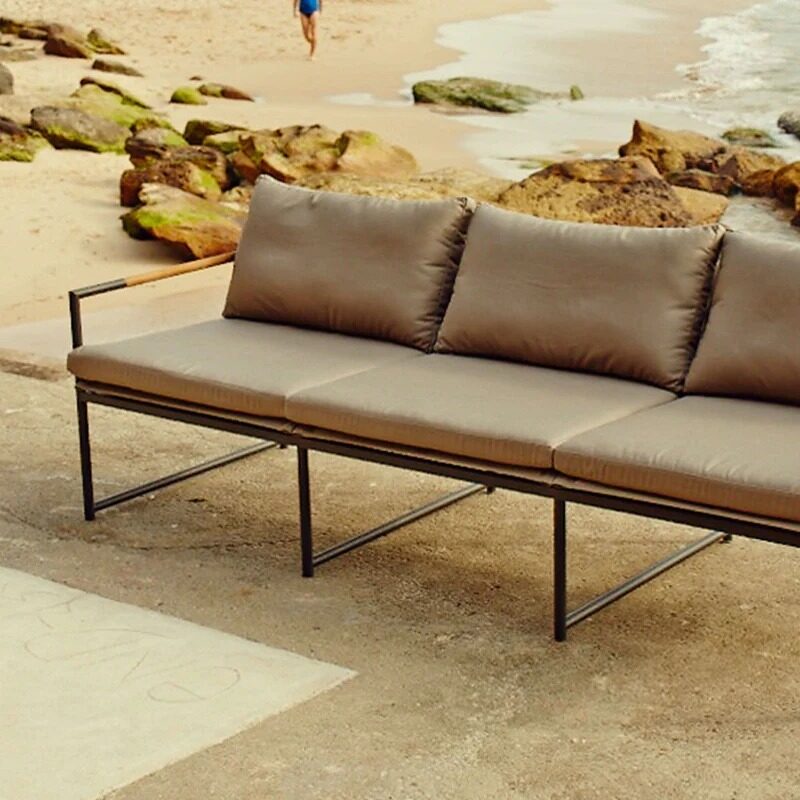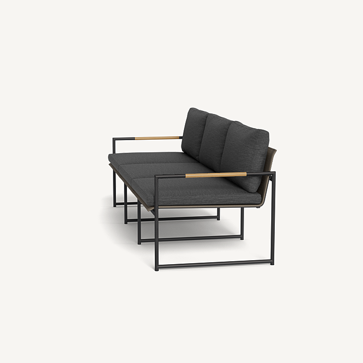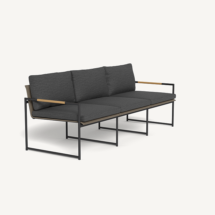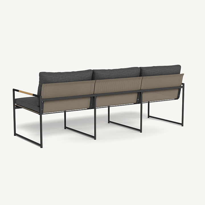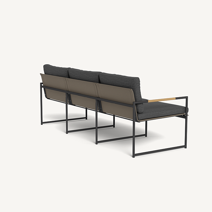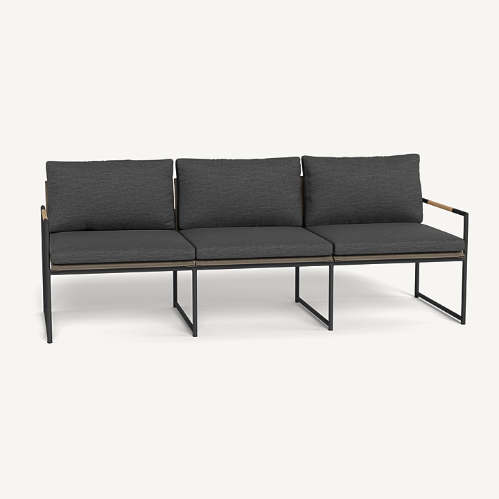 The smaller brother to our Breeze XL collection, our Breeze line mixes thin tubular aluminum construction with solid teak accents for an alluring simplicity. The low–profile Breeze 3 Seat Sofa is modern comfort — enjoy plush cushions on a powder coated extruded aluminum frame and a slatted pitched back, or use without cushions as well. A great petite option for seating, this elegant piece is perfect for smaller outdoor spaces and balconies.