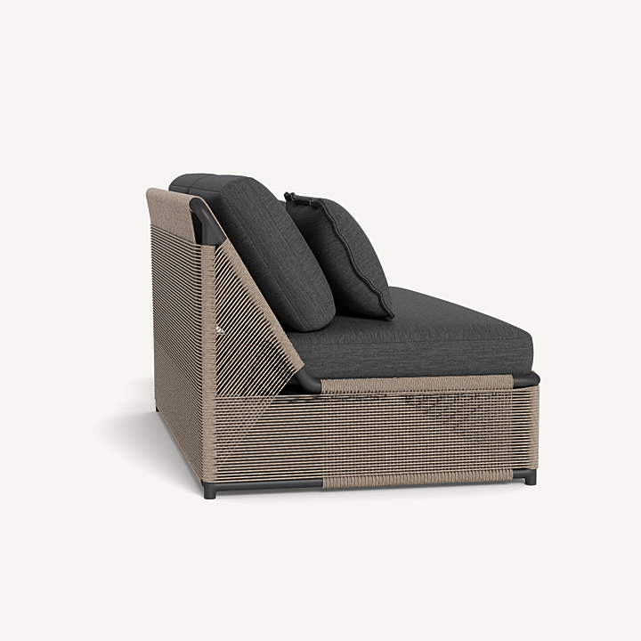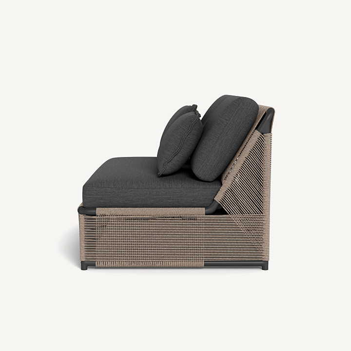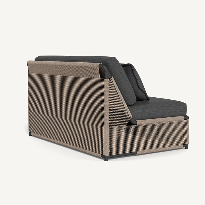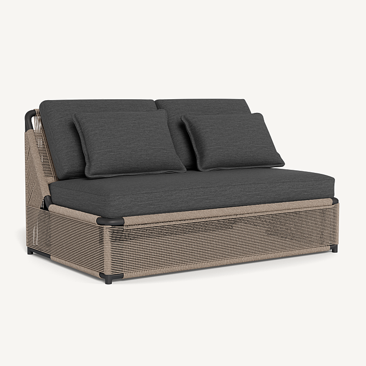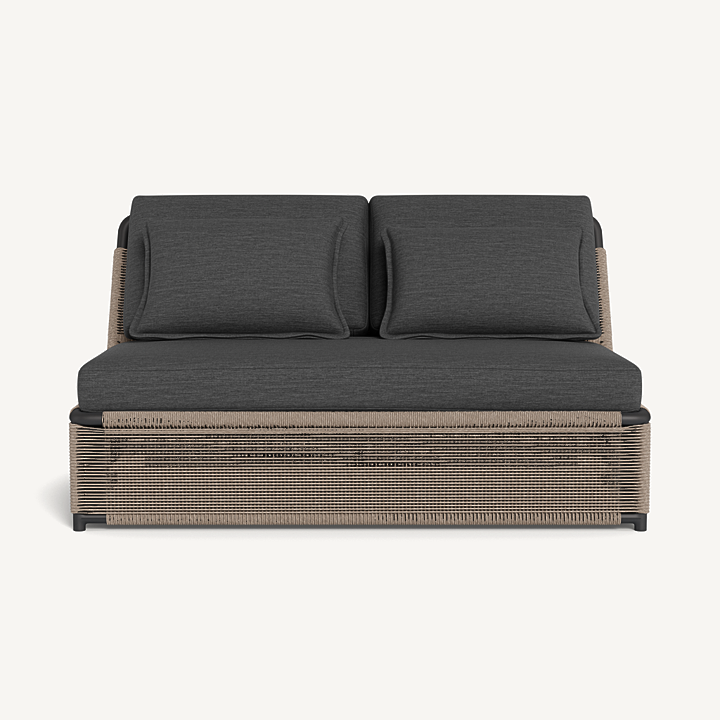 Designed by Kara Mann. Featuring exposed aluminum tube, twisted all-weather rope and deep green marble, our Formentera collection is organic luxury. The Formentera 2 Seat Armless Sofa transforms traditional aesthetics for a coastal lifestyle — enjoy outdoor cushions with extra Dacron for a plush appearance and lumbar support on an angled silhouette of tubular extruded aluminum, powder coated in bronze and hand woven with all-weather rope in our workshop. The rope features a twisted detail that recalls functional nautical ropes. Contemporary in proportion, this armless piece offers ease of use and bold shapes. Also available as a 3 Seat Armless Sofa and Lounge Chair.
