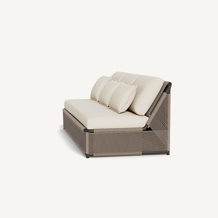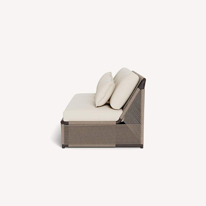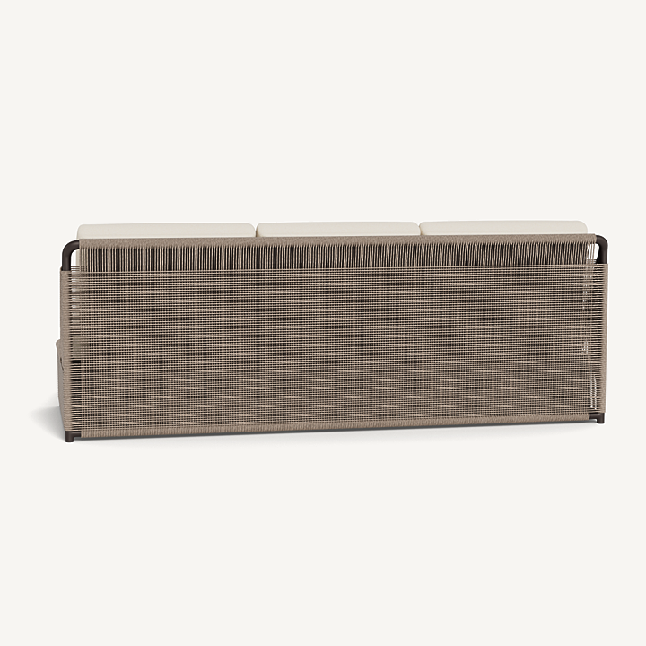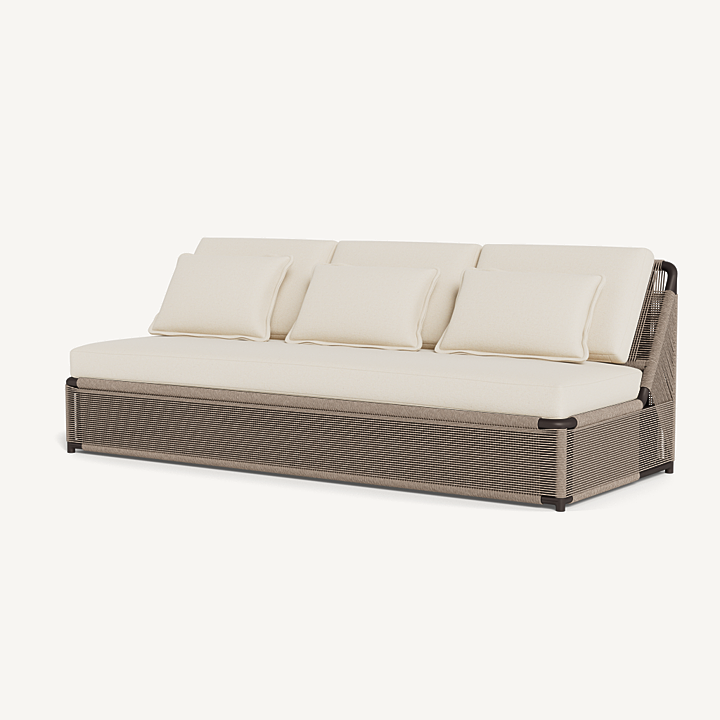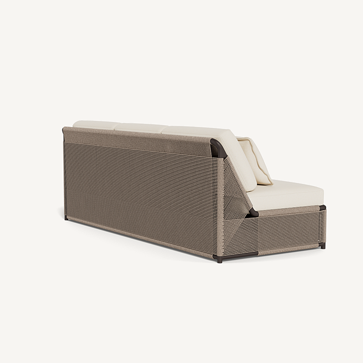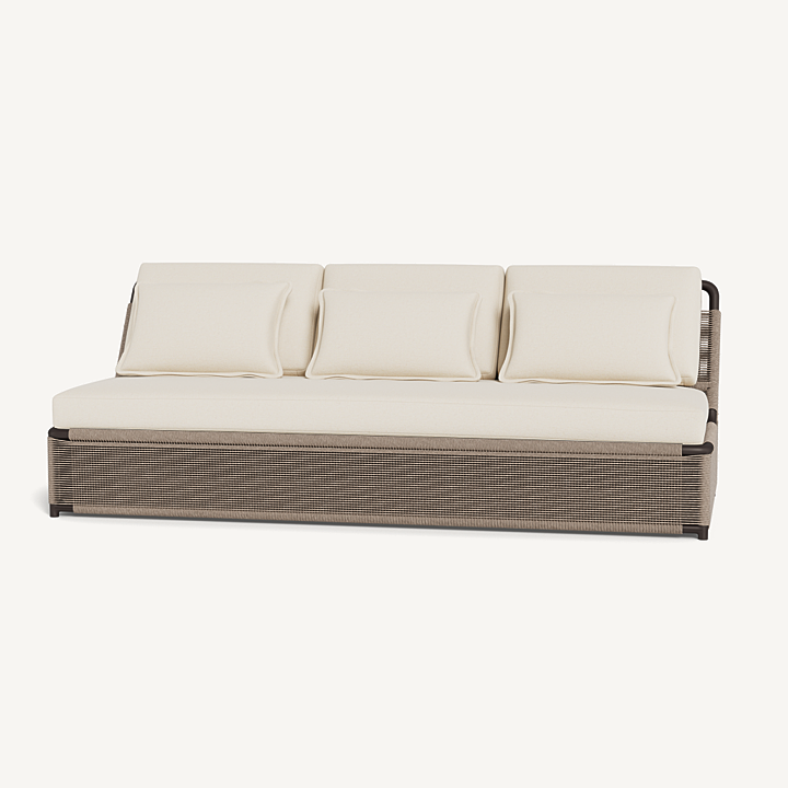 Designed by Kara Mann. Featuring exposed aluminum tube, twisted all-weather rope and deep green marble, our Formentera collection is organic luxury. The Formentera 3 Seat Armless Sofa transforms traditional aesthetics for a coastal lifestyle — enjoy outdoor cushions with extra Dacron for a plush appearance and lumbar support on an angled silhouette of tubular extruded aluminum, powder coated in bronze and hand woven with all-weather rope in our workshop. The rope features a twisted detail that recalls functional nautical ropes. Contemporary in proportion, this armless piece offers ease of use and bold shapes. Also available as a 2 Seat Armless Sofa and Lounge Chair.