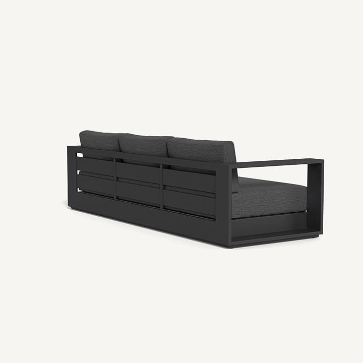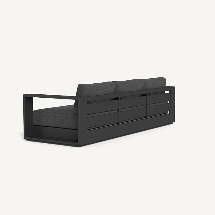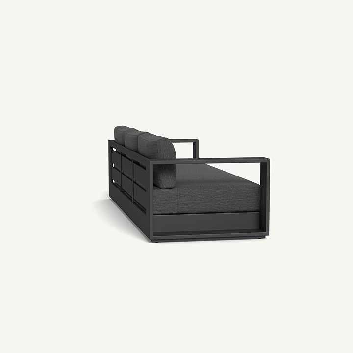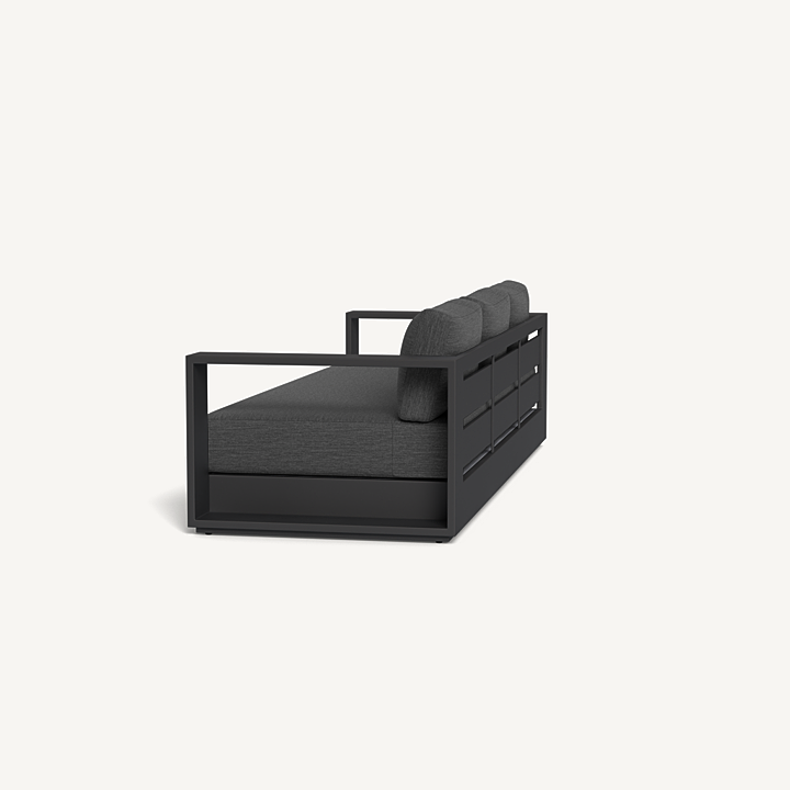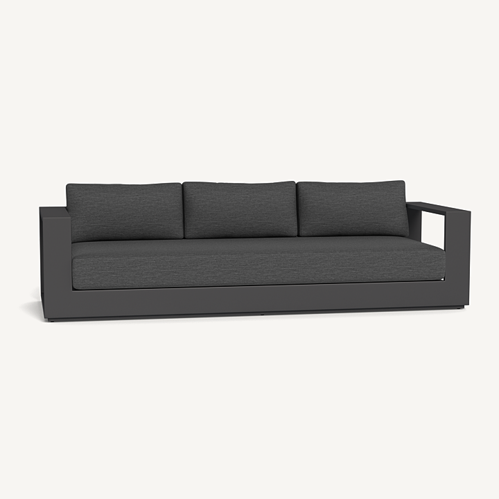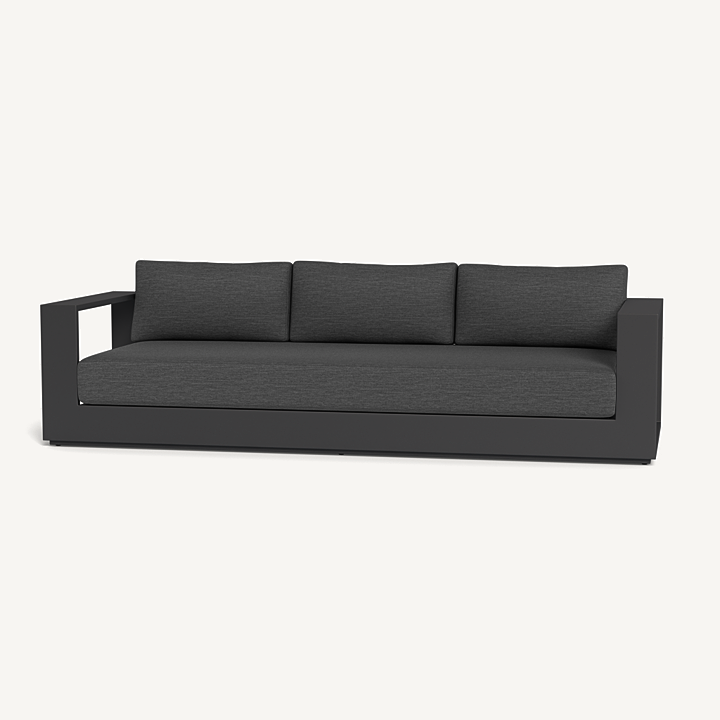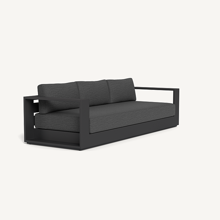 Our Hayman collection is a statement in simplicity with clean angles and modern styling. Defined by its wide arms, our low–profile Hayman 3 Seat Sofa was designed to be experienced — sink into ultimate relaxation with a deep bench cushion in a range of neutral tones supported by a Batyline sling suspension in Silver or White for added comfort, all crafted in a powder coated extruded aluminum frame available in Asteroid or White. Indoor comfort meets outdoor performance with this geometric modern sofa made for a variety of spaces.