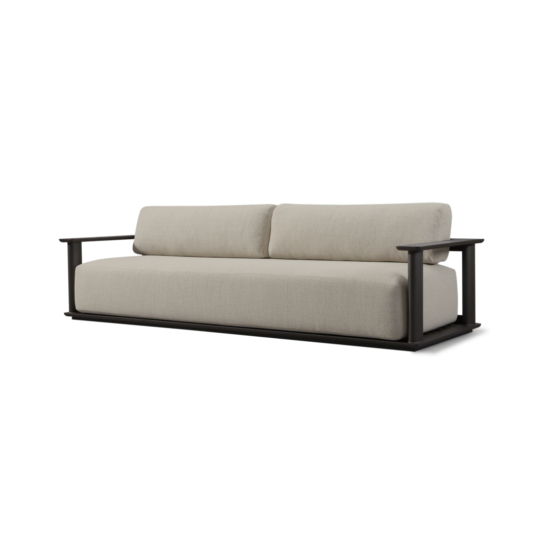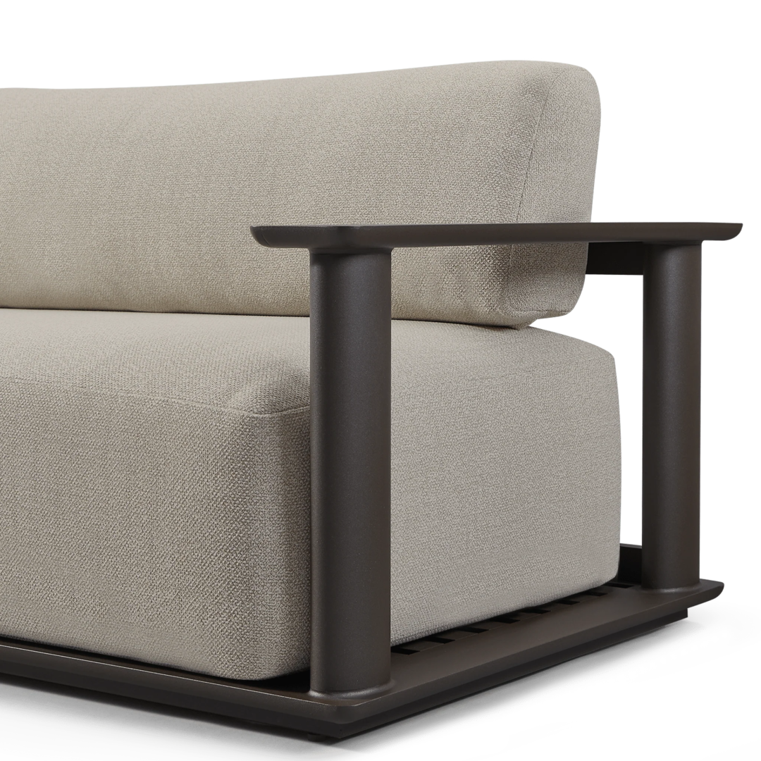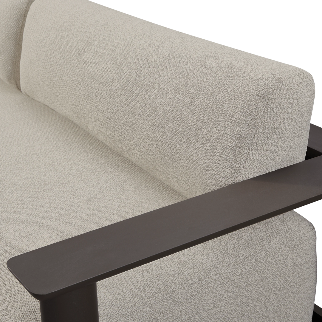Design elements like oval–shaped legs elevate a geometrical silhouette, while deep seating and wide, flat arms create comfort for all–day lounging.