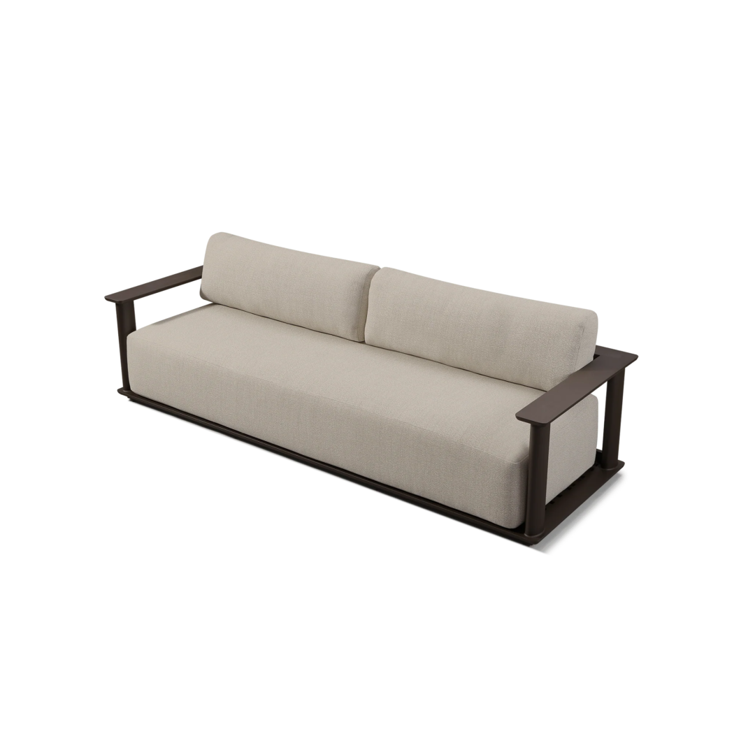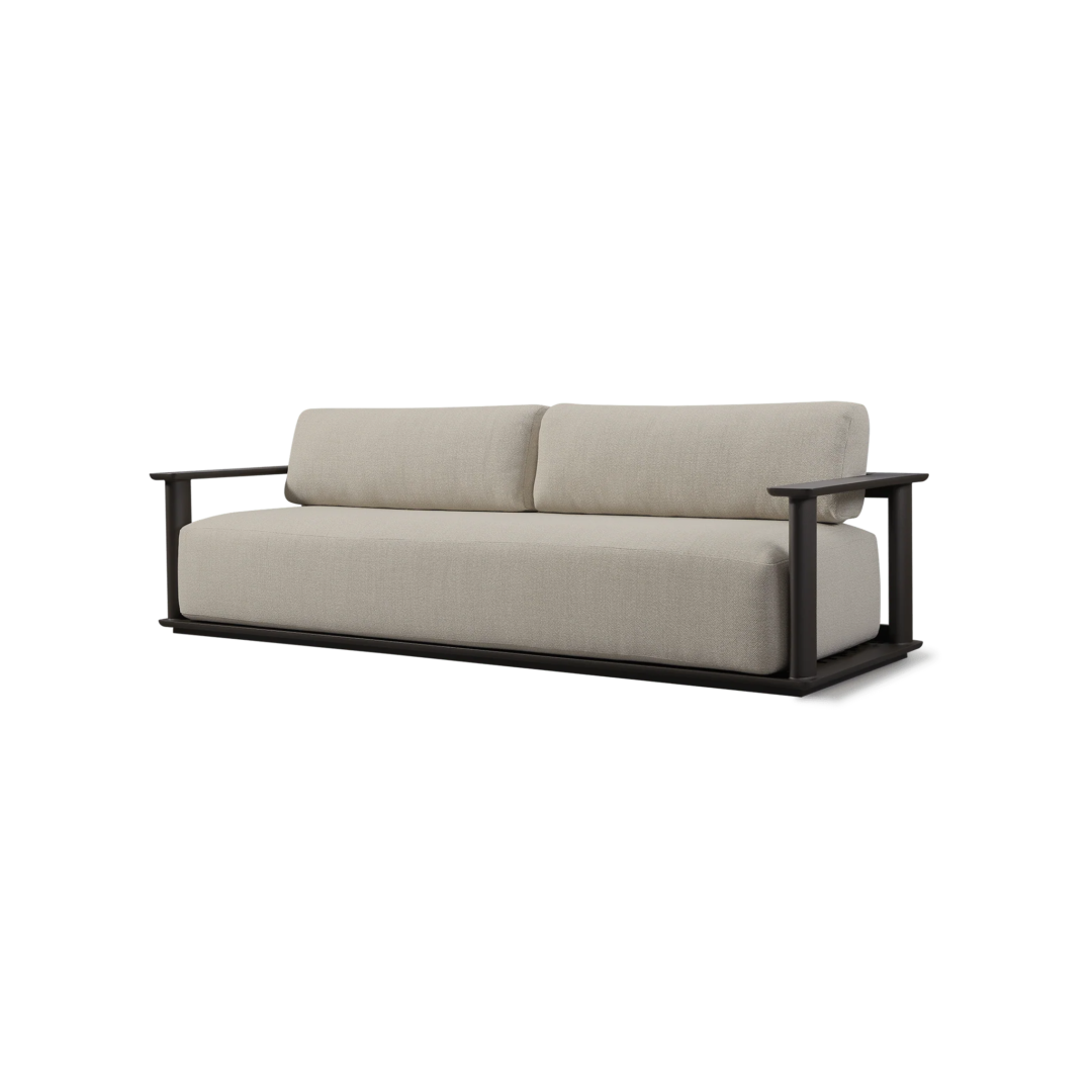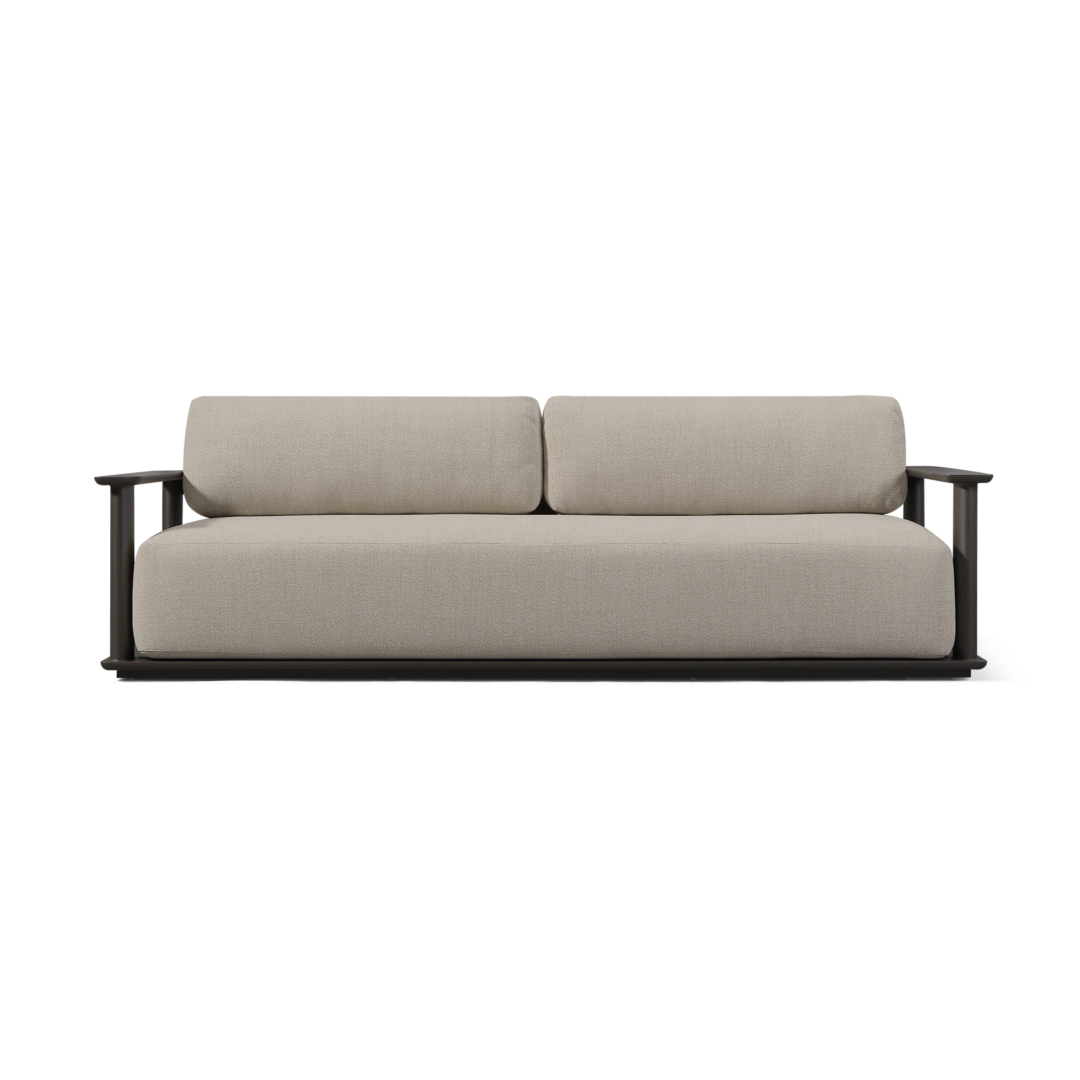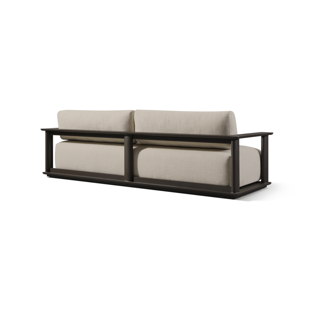 Design elements like oval–shaped legs elevate a geometrical silhouette, while deep seating and wide, flat arms create comfort for all–day lounging.
