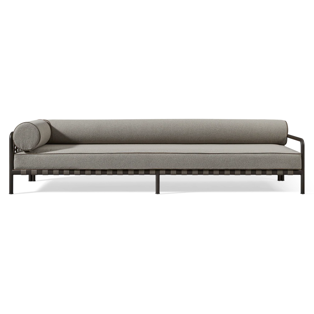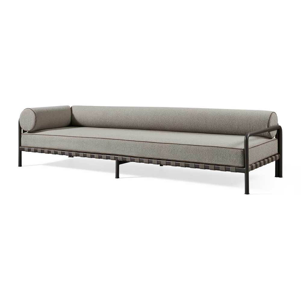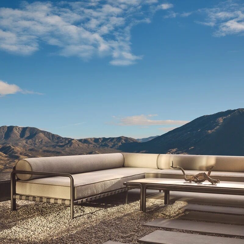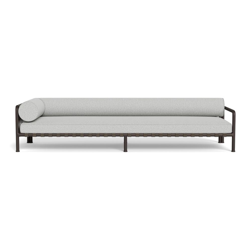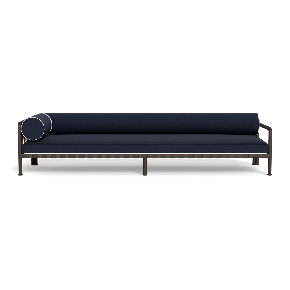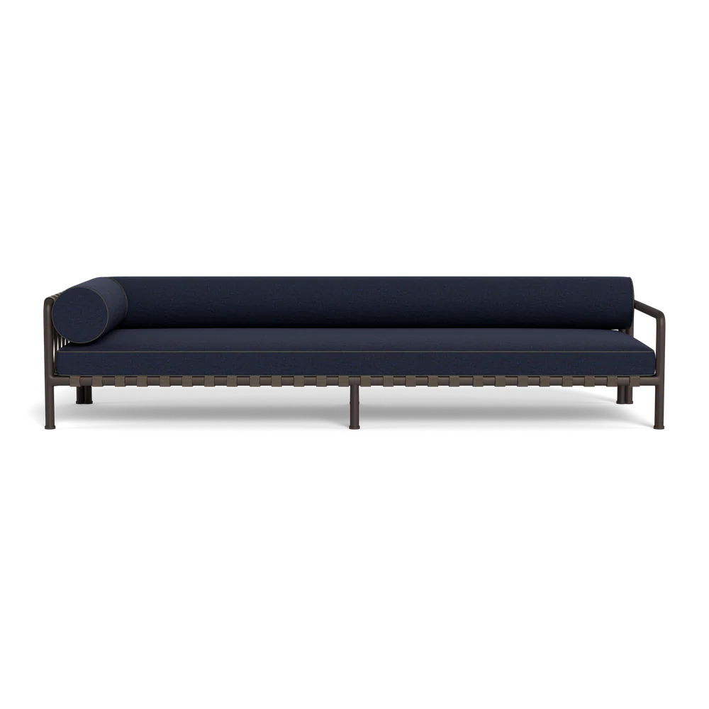 Tubular bronze aluminum, thick strapping and refined piping effortlessly update mid–century charm with contemporary sophistication for any outdoor space. The Parker Return Right is a bold design statement—enjoy a comfort–driven bench cushion and bolster back, supported by a tubular metal frame and high–quality strapping woven in parallel lines in both directions for added interest as it’s spotted through the seat deck or back. Details like contrast piping and a subtle shape placed at the foot complete this design–forward low seating collection. A gorgeous and intricately crafted piece, this modular outdoor sofa brings a touch of tradition into modern day. Pair it with our 2 seat 1 arm sofa (of the opposite arm orientation) to create an inviting cornering sectional.
