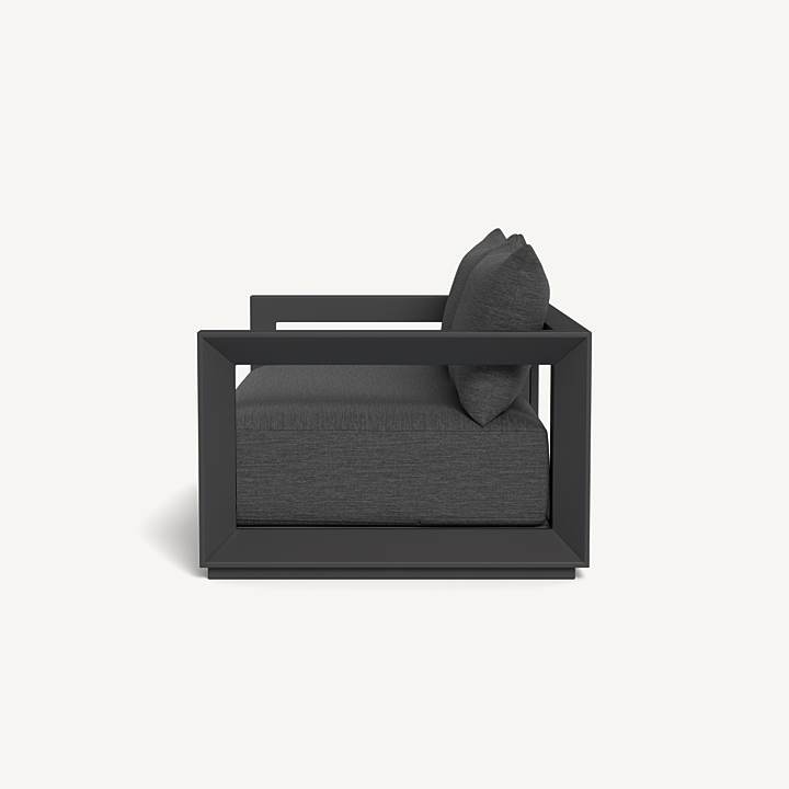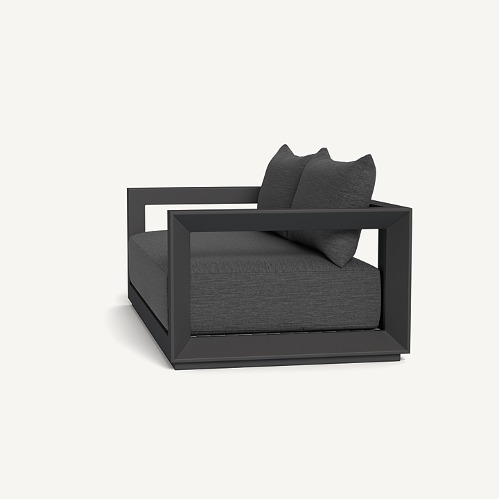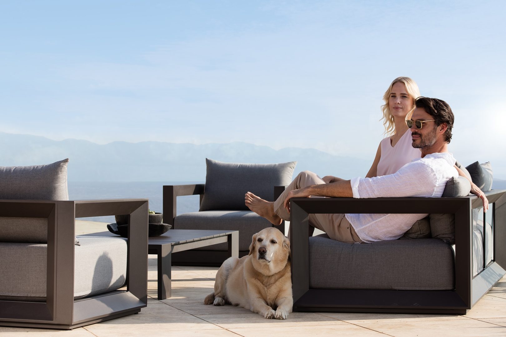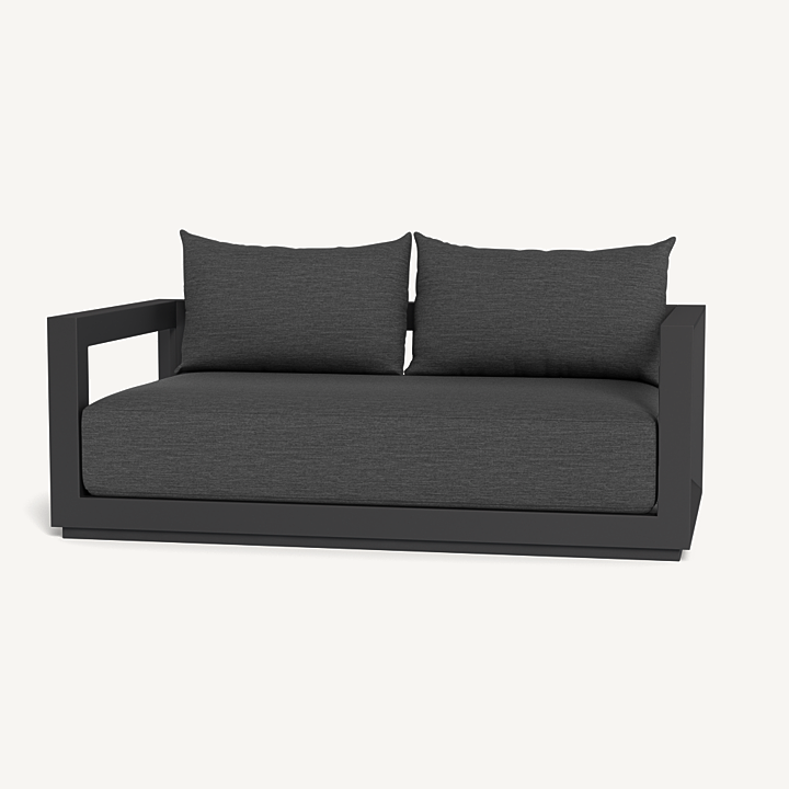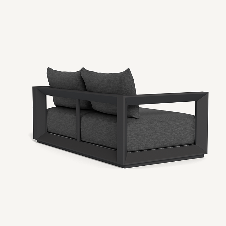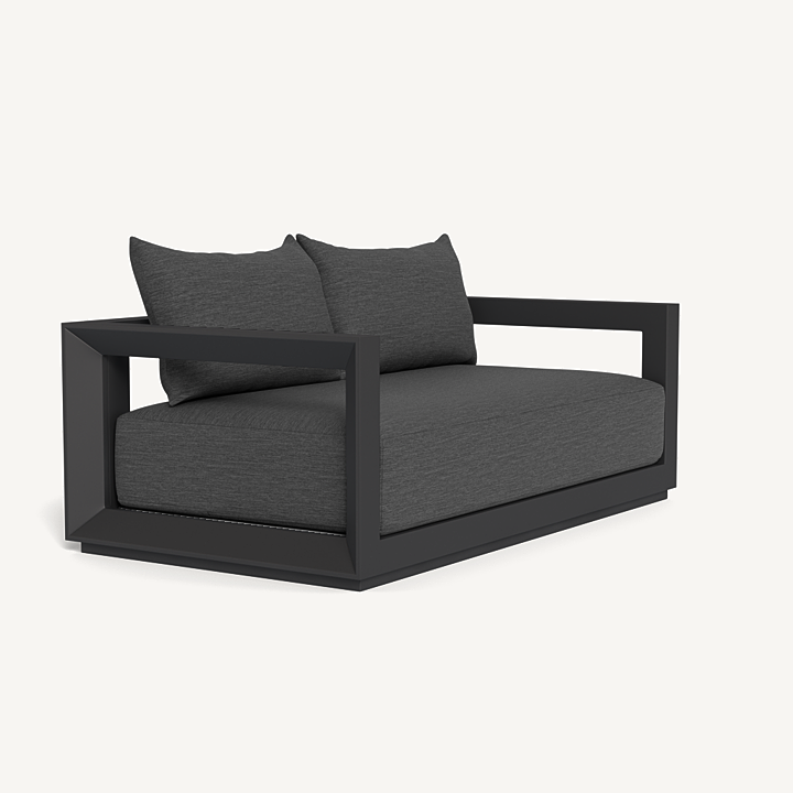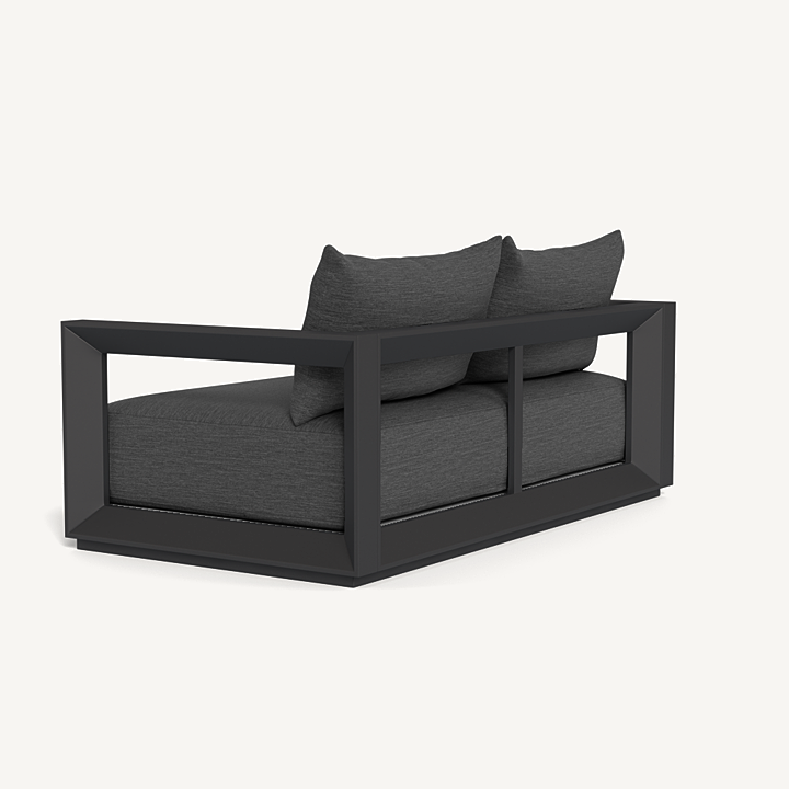 Our Vaucluse collection explores simple geometries with angular details in a contemporary study of triangles. Surprising and subtle, the Vaucluse 2 Seat Sofa is the perfect escape — lounge on a deep all–weather bench cushion supported by a Batyline sling suspension on a powder coated extruded aluminum frame. Outwardly square geometries actually angle inward in triangular form, creating a dynamic play on shapes that defines the design. This streamlined piece is equally versatile, bringing a sense of balance to any smaller space.