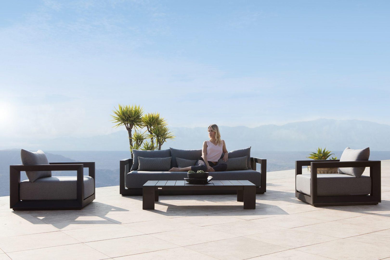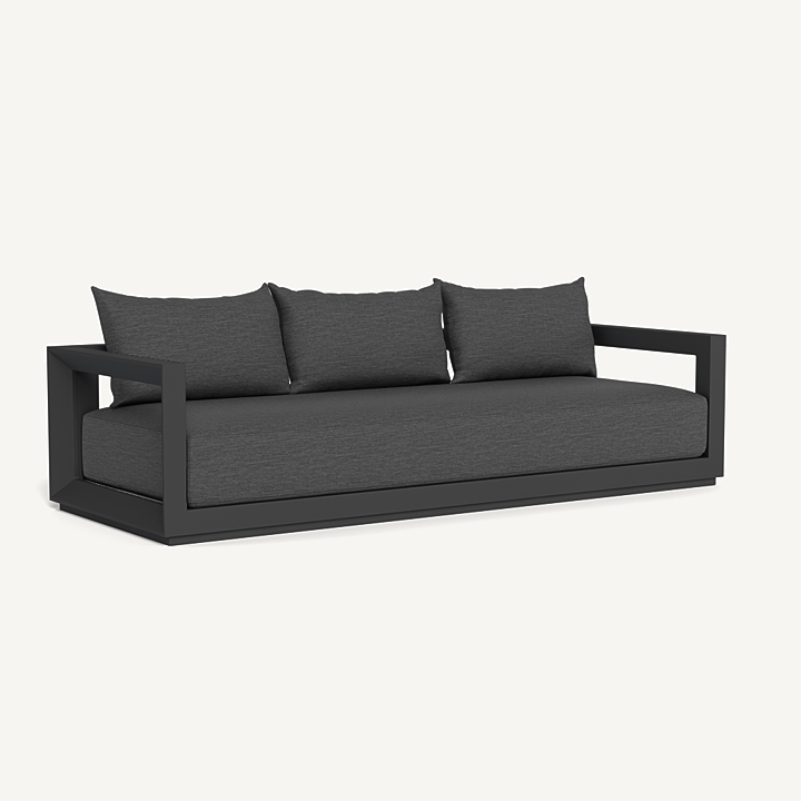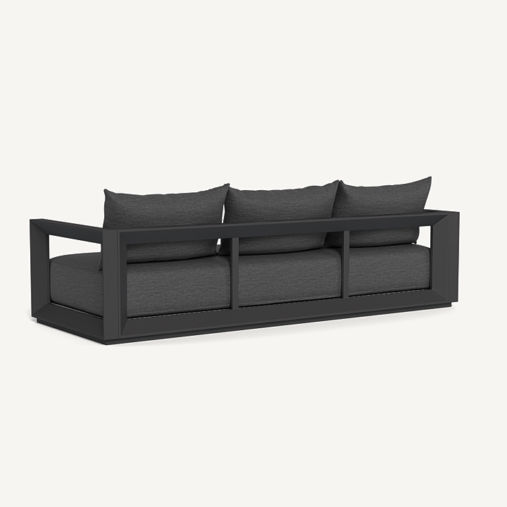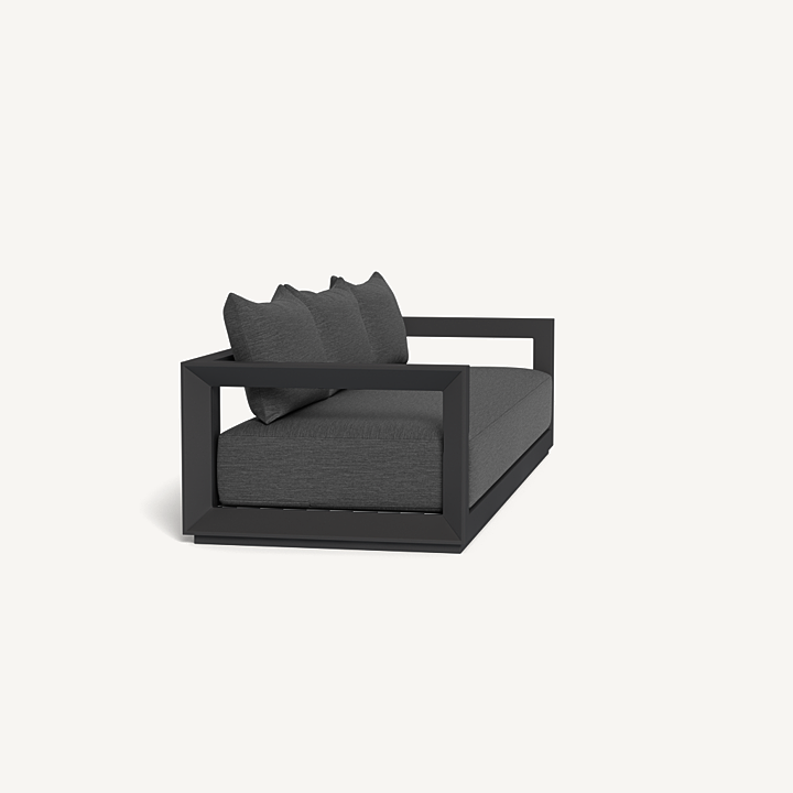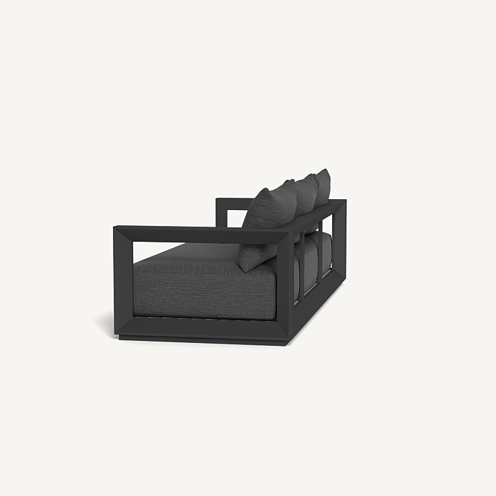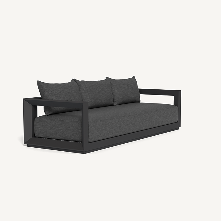 Our Vaucluse collection explores simple geometries with angular details in a contemporary study of triangles. Surprising and subtle, the Vaucluse 3 Seat Sofa is the perfect escape — lounge on a deep all–weather bench cushion supported by a Batyline sling suspension on a powder coated extruded aluminum frame. Outwardly square geometries actually angle inward in triangular form, creating a dynamic play on shapes that defines the design. This streamlined piece is equally versatile, bringing a sense of balance to any space.
