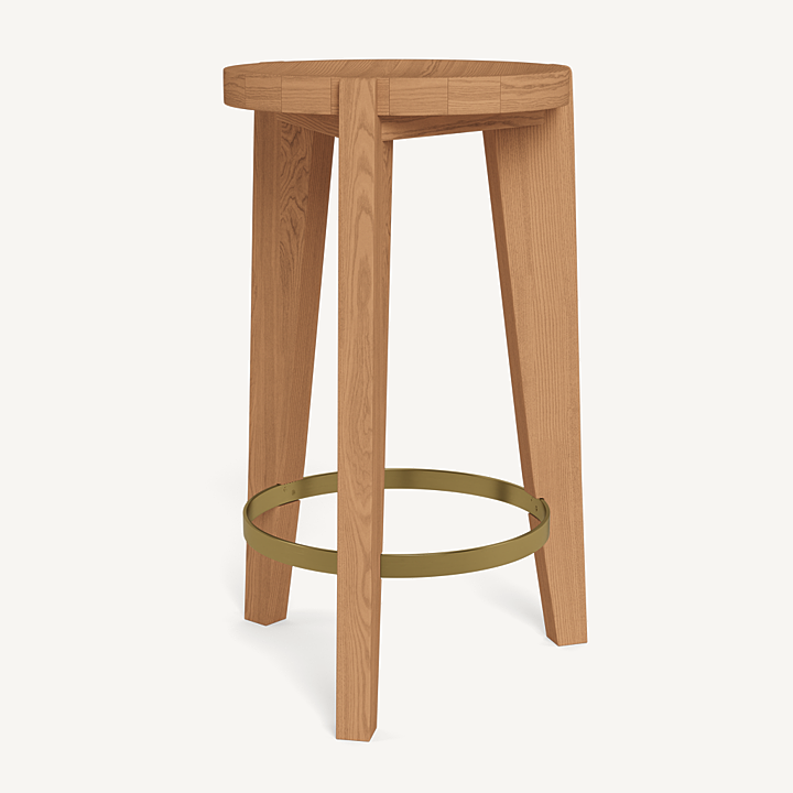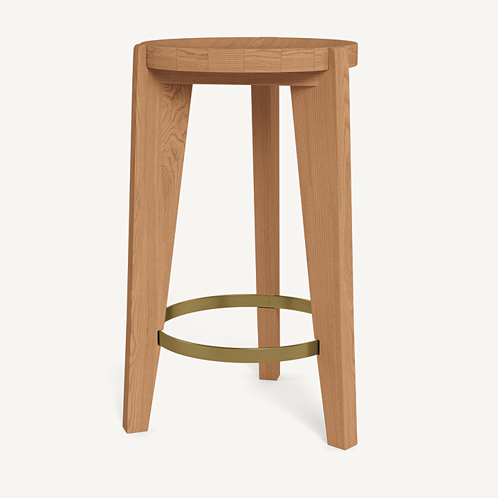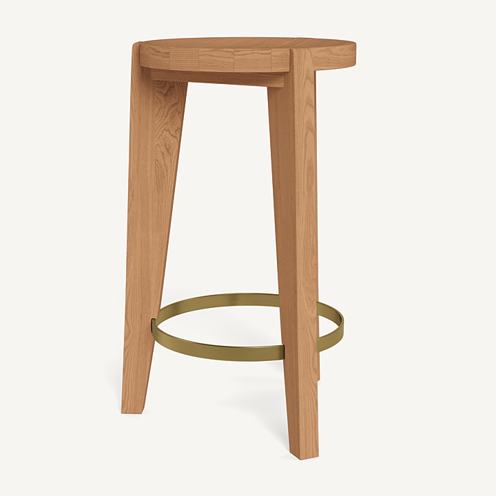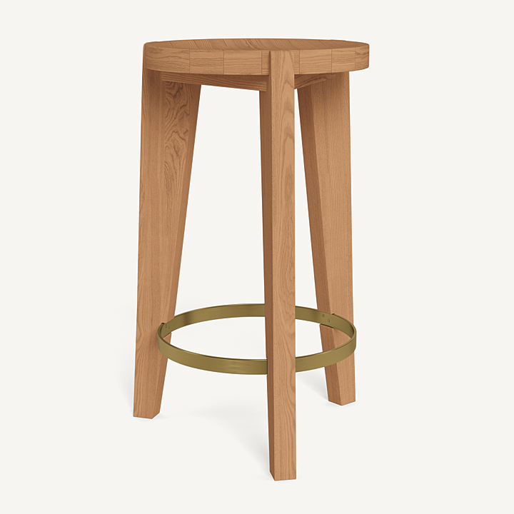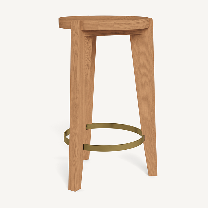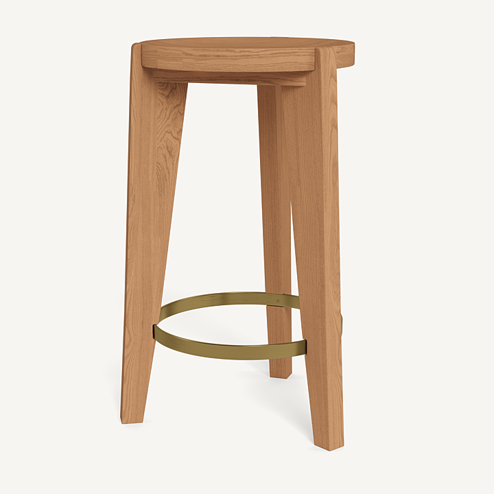 A contemporary update to French midcentury shapes. Tripod construction in natural teak with a hint of brass creates a beautiful play of negative space to keep other pieces in conversation.