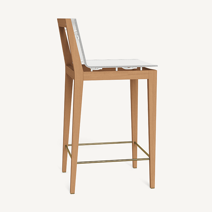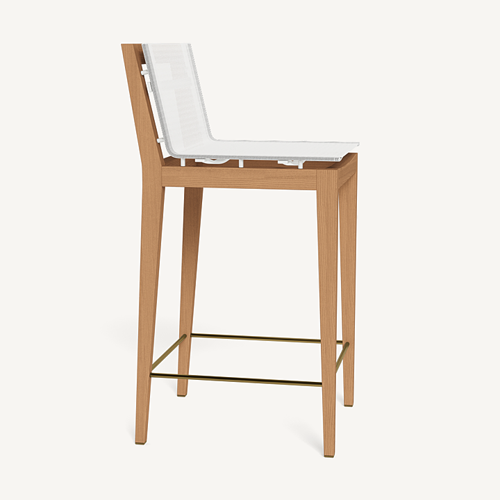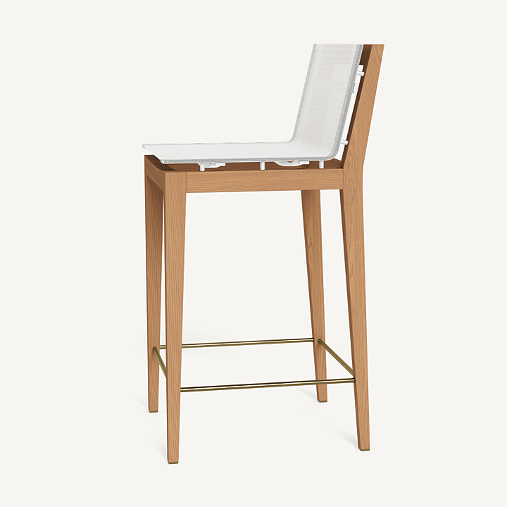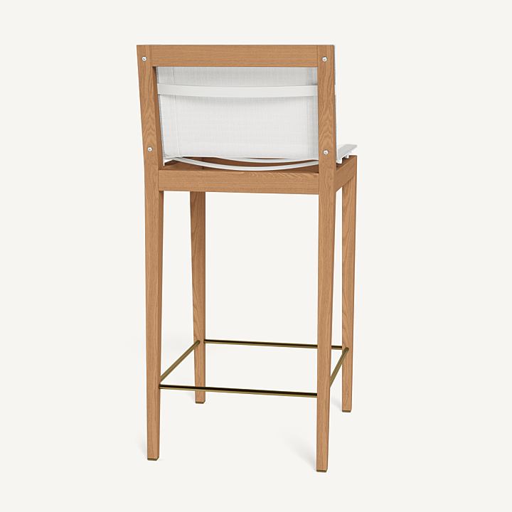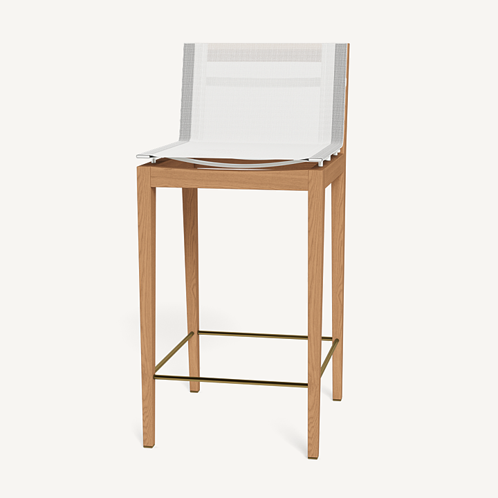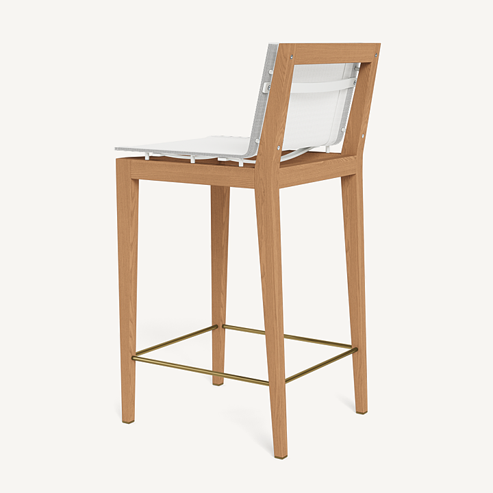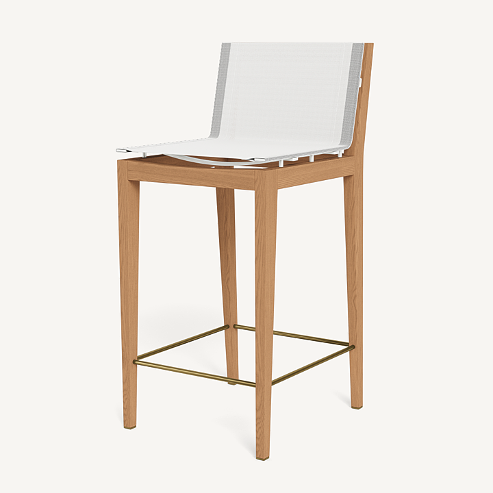 Our Byron collection blends sophisticated styling with an architectural play of angles to create exceptional design. A unique take on the typical stool, the Byron Counter Stool was designed as the perfect outdoor bar seating — enjoy an all–weather Batyline mesh seat for comfort, supported by a handcrafted solid Indonesian teak frame. Brass–toned accents highlight the luxury inherent in the craft and really set this chair apart. With a subtle elegance, this highly usable bar–height piece instantly enhances any space.