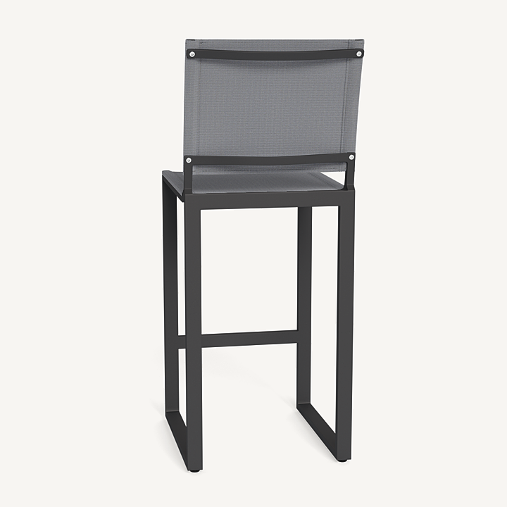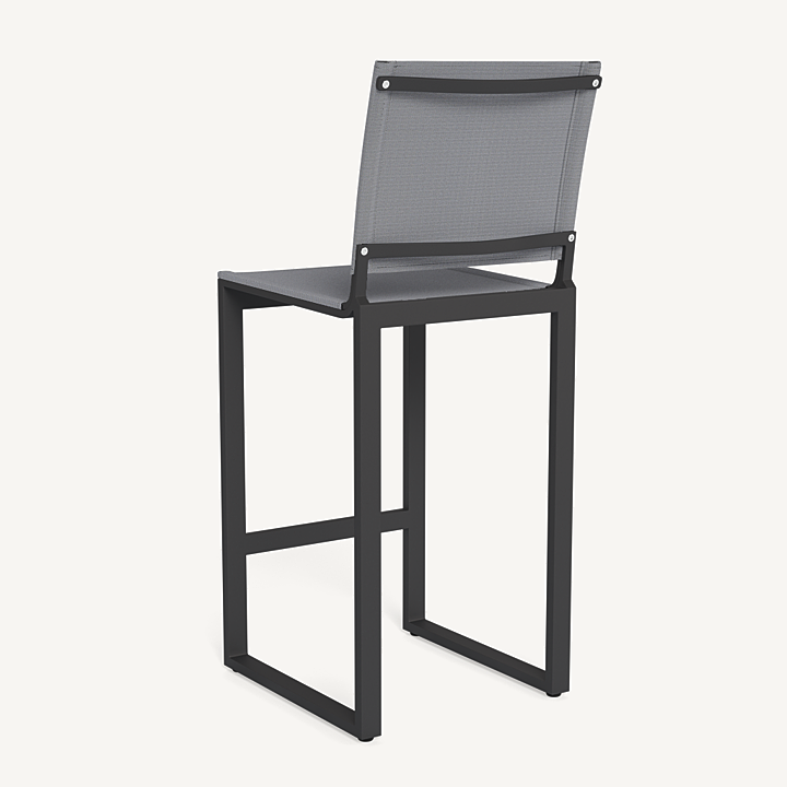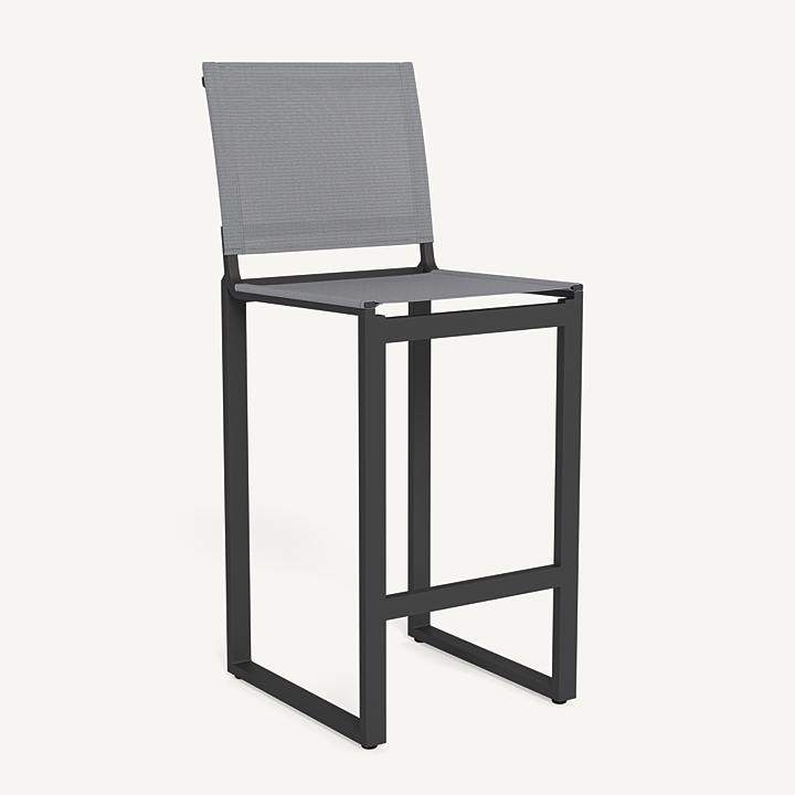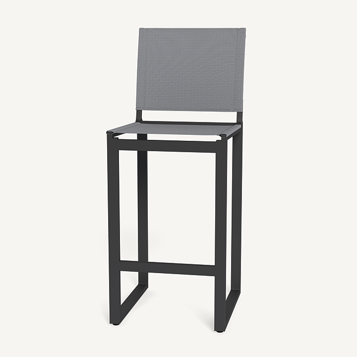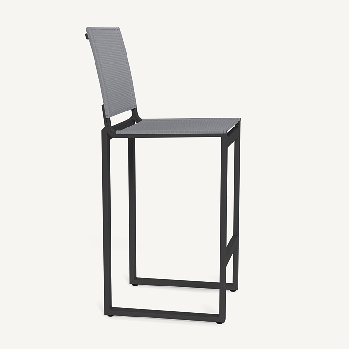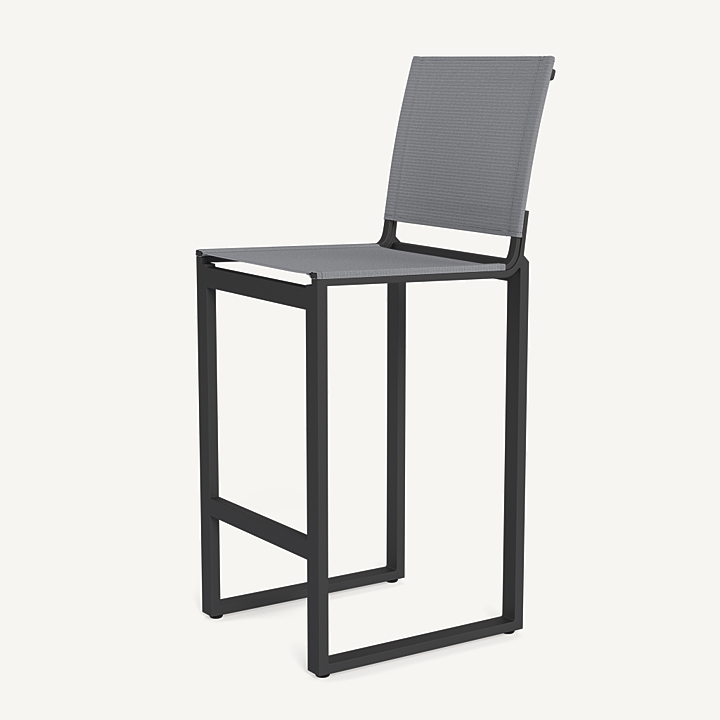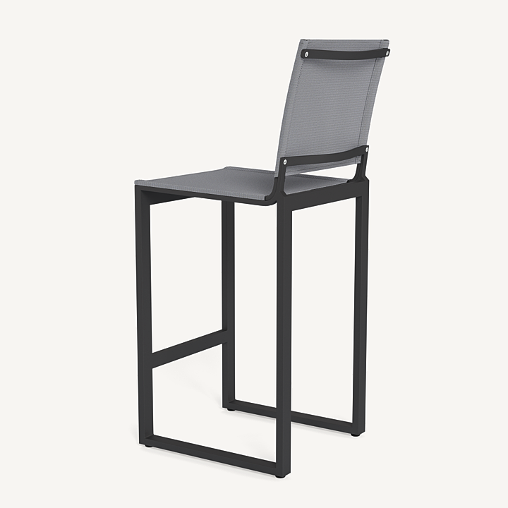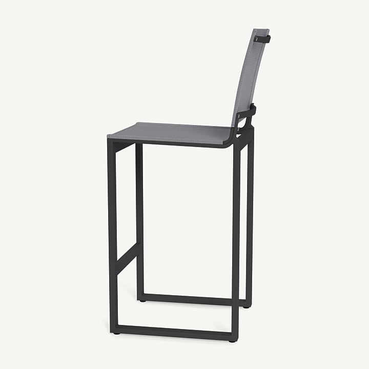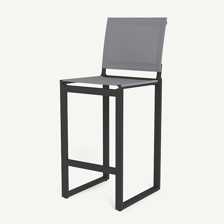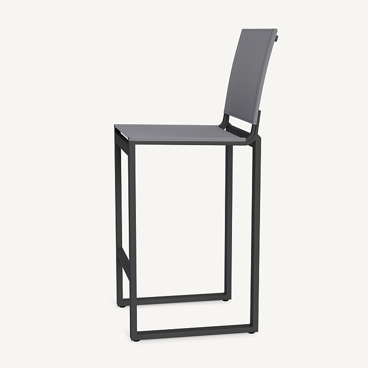 Our Hayman collection is a statement in simplicity with clean angles and modern styling. The armless version of our bar stool, our Hayman Armless Bar Stool was designed as the perfect everyday seat for counter spaces — enjoy a simple, modern chair with an aluminum extrusion frame available in Asteroid or White supported by a Batyline sling suspension in Silver or White for added comfort and easy cleaning. With the arms removed, getting in and out of tighter spaces is a breeze. Indoor–inspired comfort meets outdoor performance with this modern armless bar–height stool made for a variety of spaces.