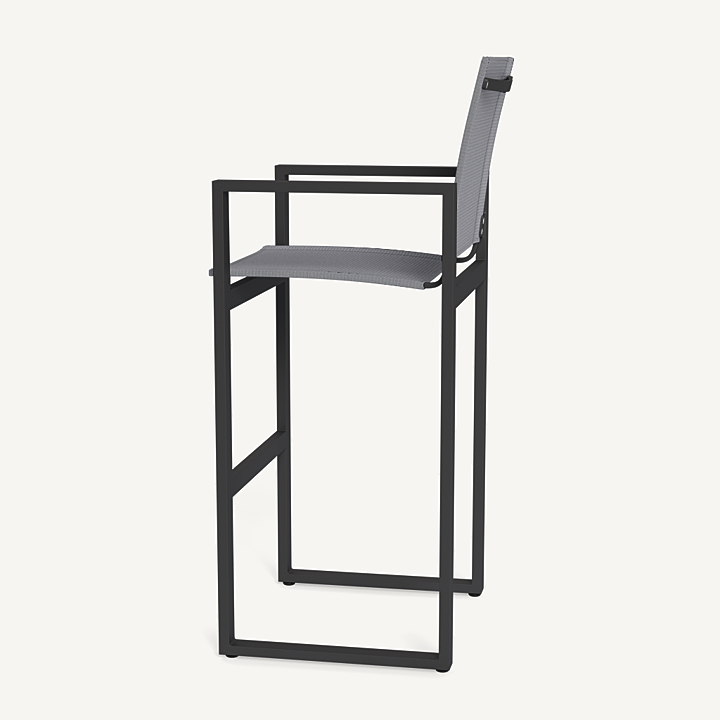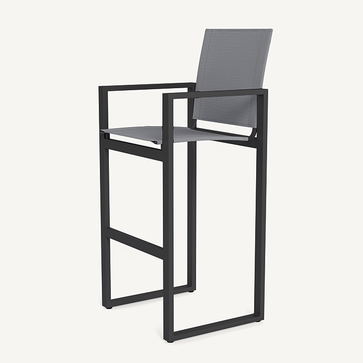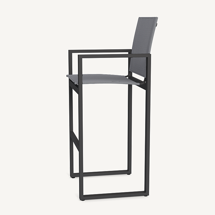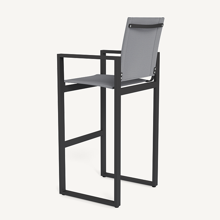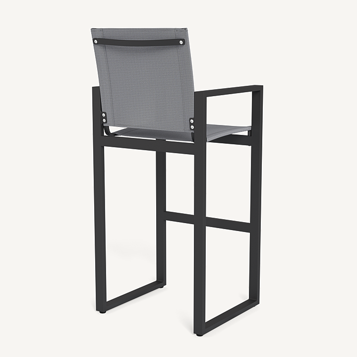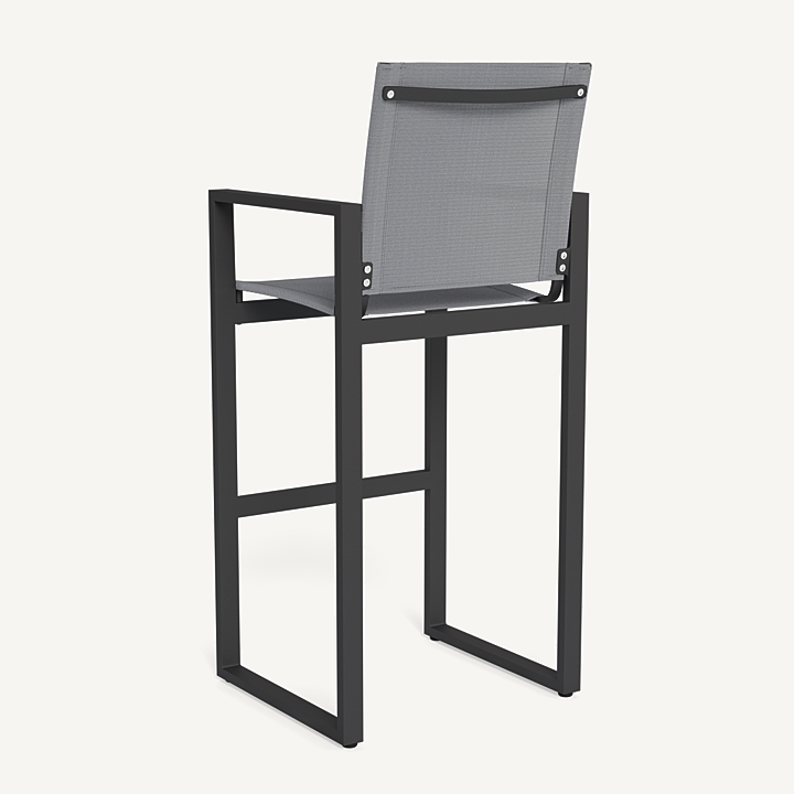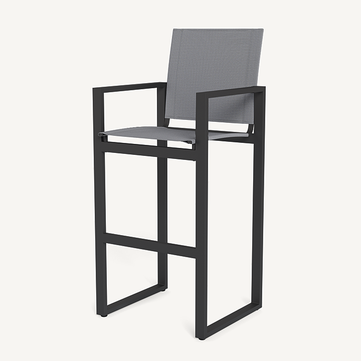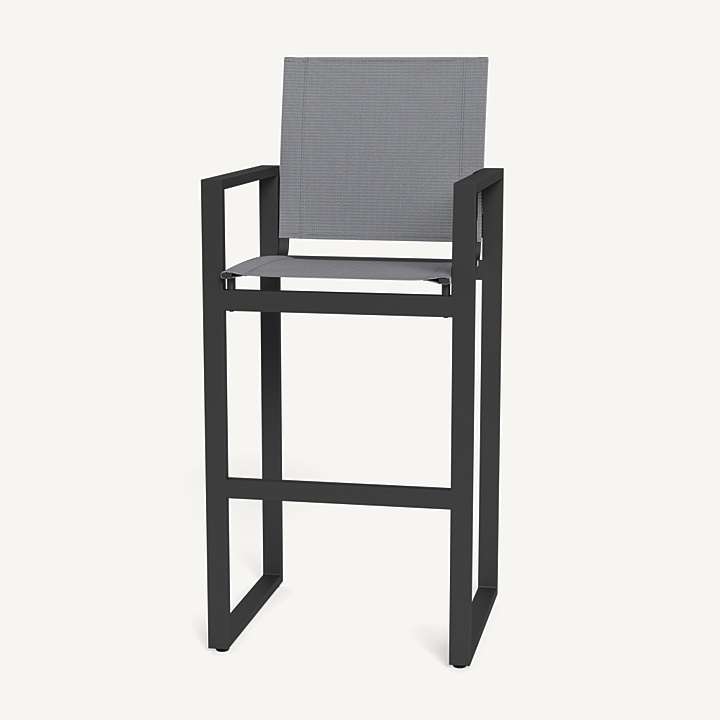 Our Hayman collection is a statement in simplicity with clean angles and modern styling. The highest version of our dining chair, our Hayman Bar Stool was designed as the perfect everyday seat for bar tables and al fresco entertaining — enjoy a simple, modern chair with an aluminum extrusion frame available in Asteroid or White supported by a Batyline sling suspension in Silver or White for added comfort and easy cleaning. Indoor–inspired comfort meets outdoor performance with this modern bar–height stool made for a variety of spaces.