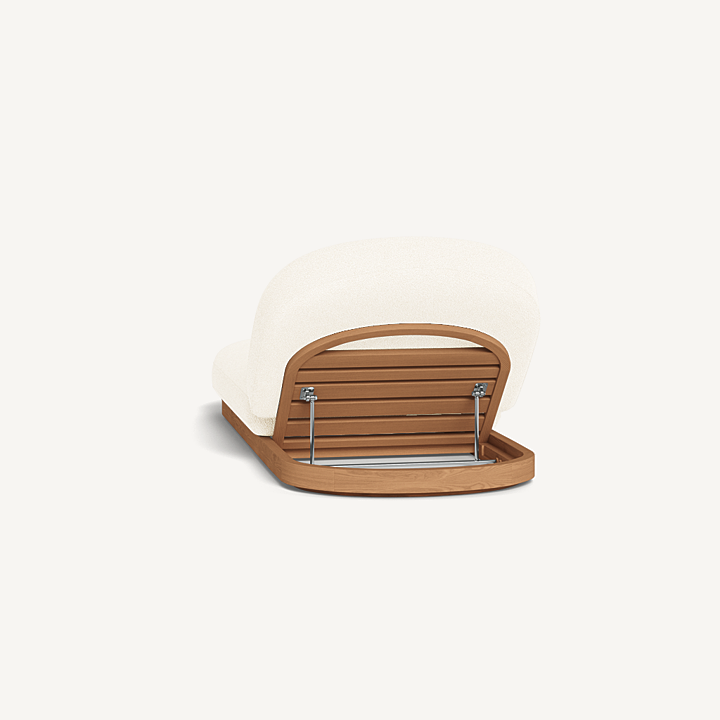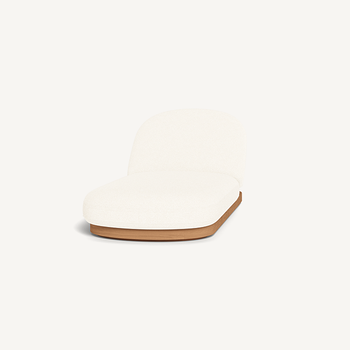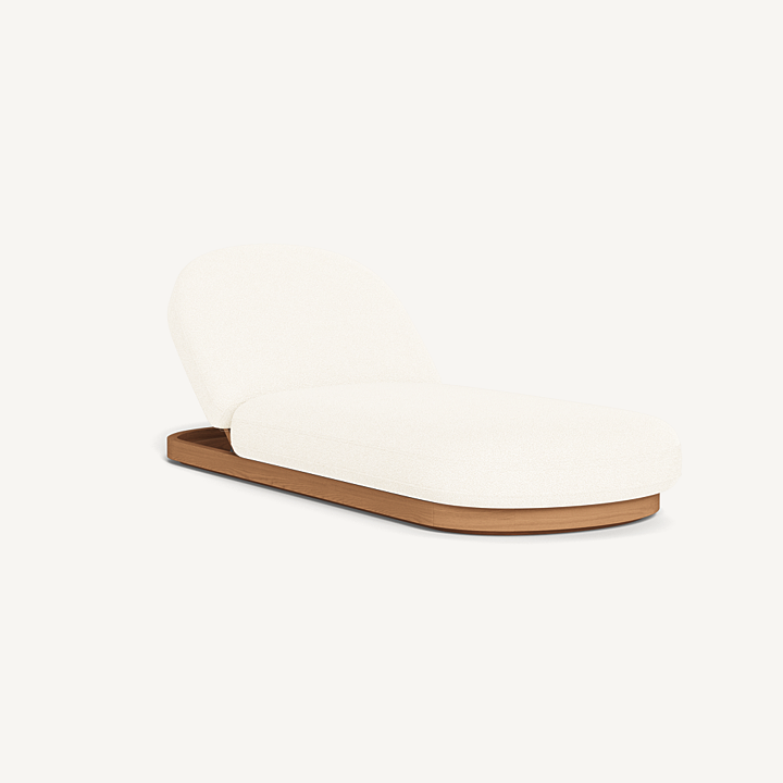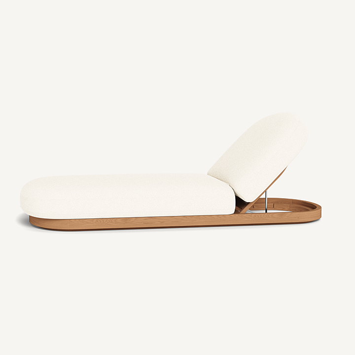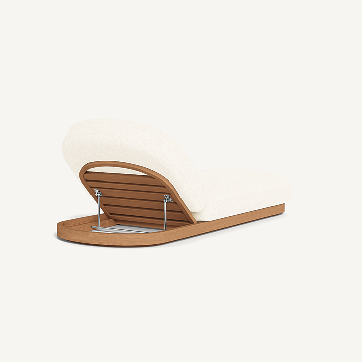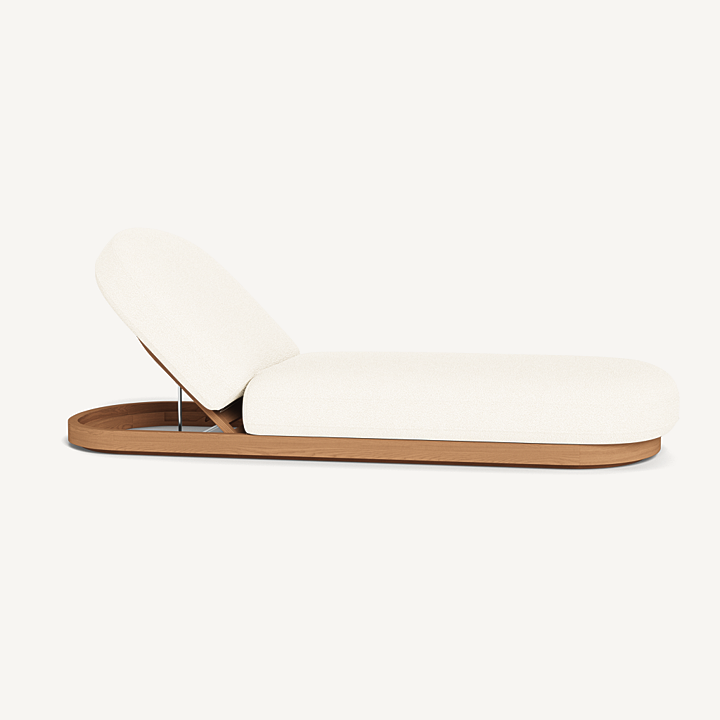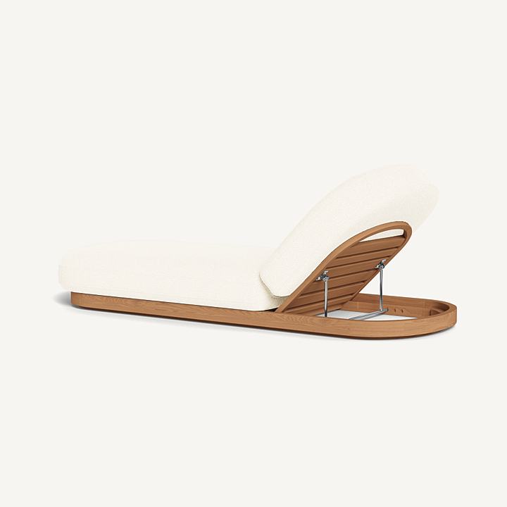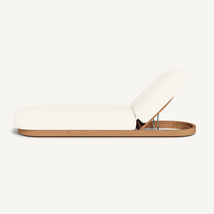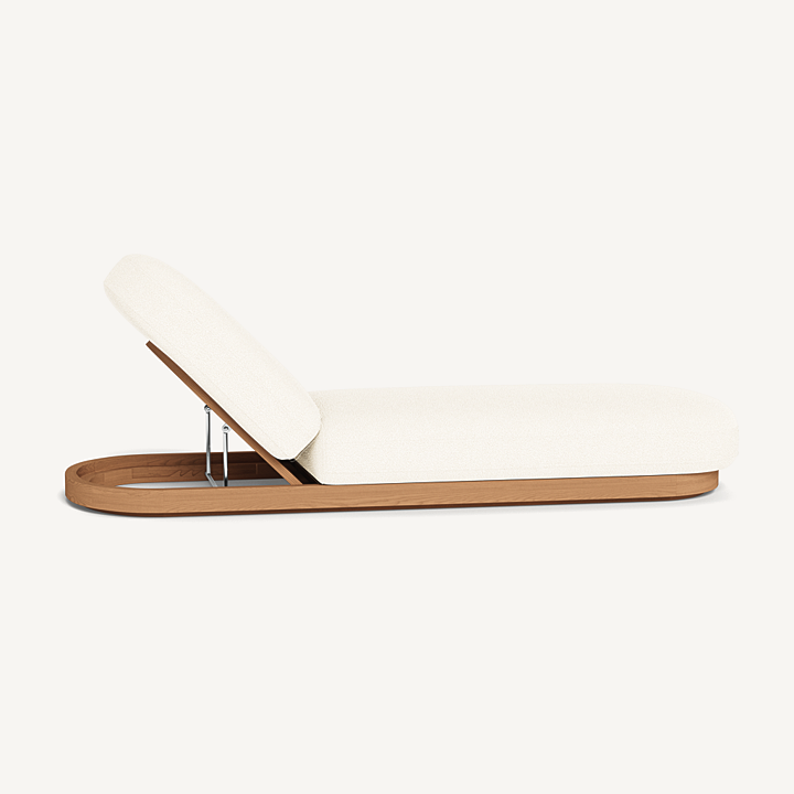 Como Sun Lounge — Luxury Outdoor Chaise Lounge with Adjustable Backrest. The Como Sun Lounge features a subtly pill–shaped design that combines the high–end style and comfort of indoor furniture with the durability of outdoor seating. Expertly upholstered in performance textiles, this chaise lounge sits on a solid teak base in Natural, offering both style and strength. With quick–dry foam for added comfort, it’s engineered for a supported sink–in feel that makes lounging effortless. This luxury outdoor chaise lounge is an elevated take on outdoor relaxation, perfect for your poolside, patio, or garden retreat. The adjustable backrest allows you to discover the perfect lounging incline, ensuring ultimate comfort wherever you choose to unwind.