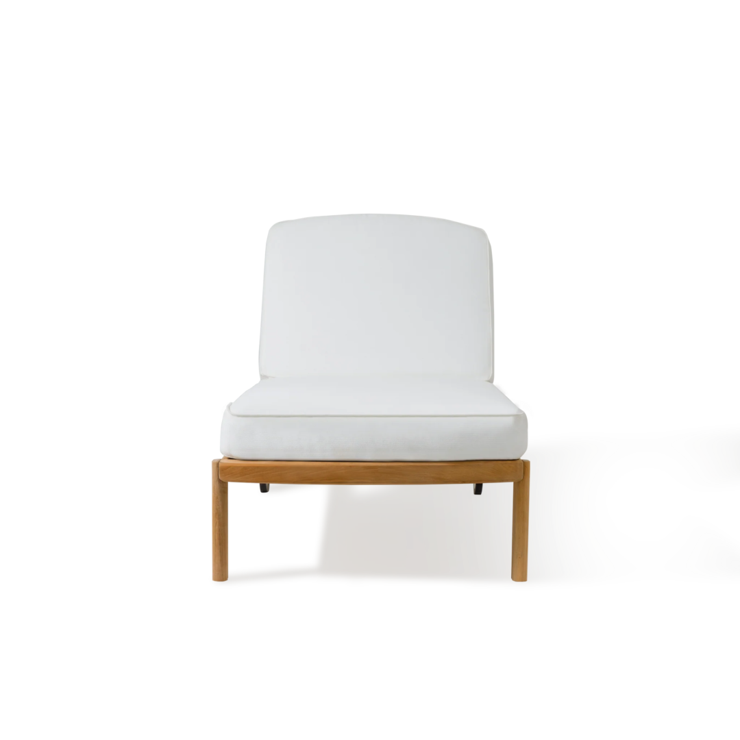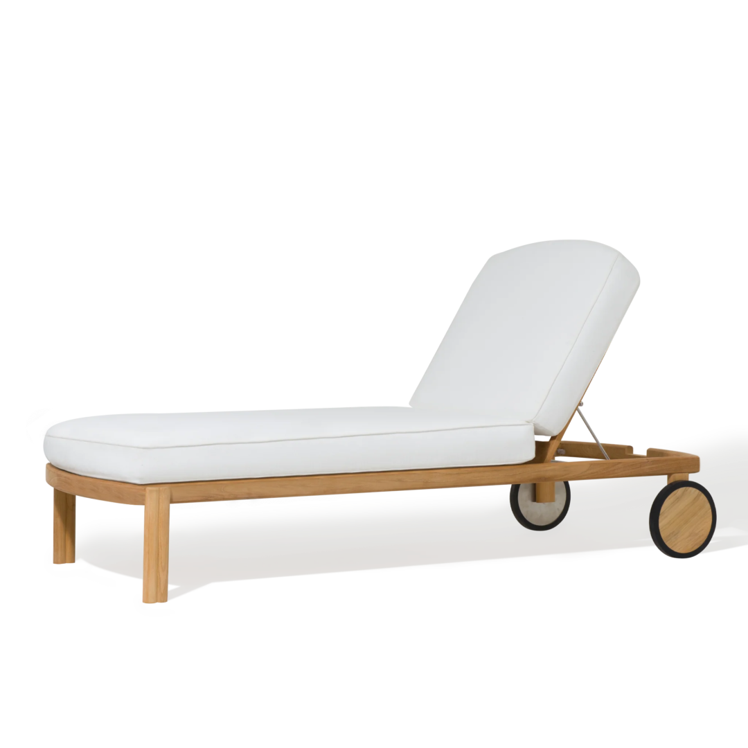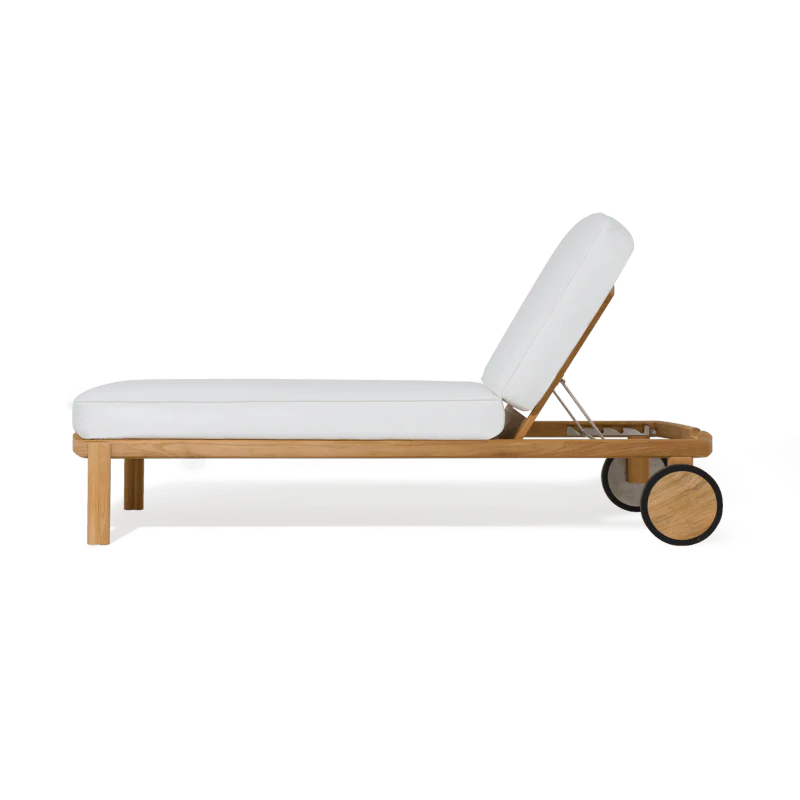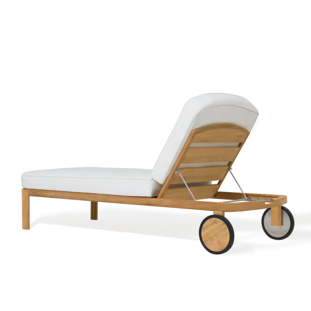 Influenced by modern Australian architecture and landscapes, our Cove Teak collection features special details like double cylindrical legs and curved edges that create soft sculptural silhouettes. The Cove Teak Sun Lounge is contemporary comfort, featuring a refined solid teak frame with an architectural double leg detail and special curved shape that echoes the design language signature to this collection. Enjoy a plush all-weather hinged cushion that invites sink-in comfort. Rear rubberized wheels add function and style. Tracery and light with a footprint to match, this comfort-driven outdoor sun lounge is a versatile design element for any space.