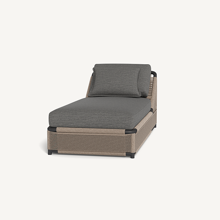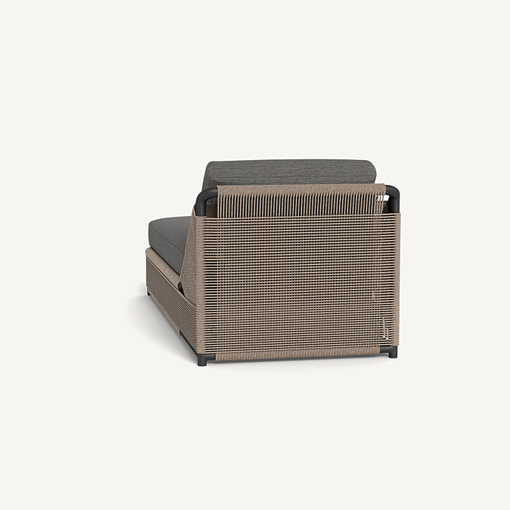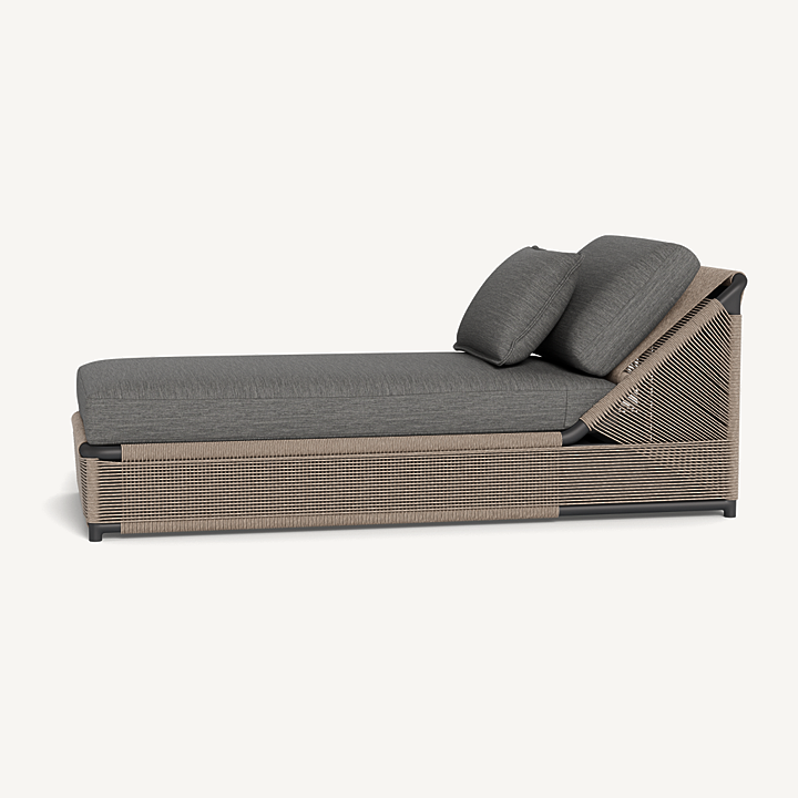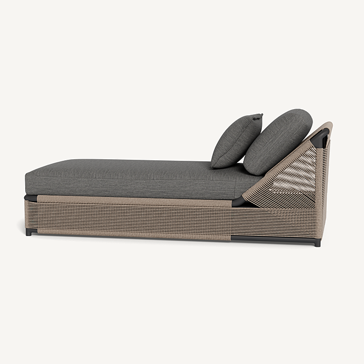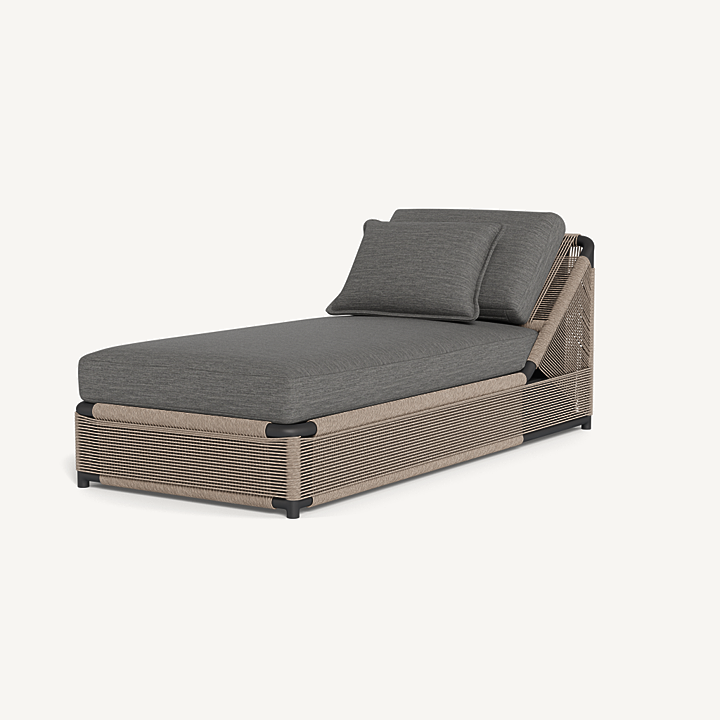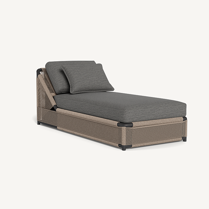 Designed by Kara Mann. Featuring exposed aluminum tube, twisted all-weather rope and deep green marble, our Formentera collection is organic luxury. Generous in scale and comfort, the Formentera Sun Lounge transforms traditional aesthetics for a coastal lifestyle — enjoy outdoor cushions with extra Dacron for a plush appearance framed by a relaxed pitched back (fixed) of tubular extruded aluminum, powder coated in bronze and hand woven with all-weather rope in our workshop. The rope features a twisted detail that recalls functional nautical ropes. Contemporary in proportion, this piece offers ease of use and a striking silhouette.