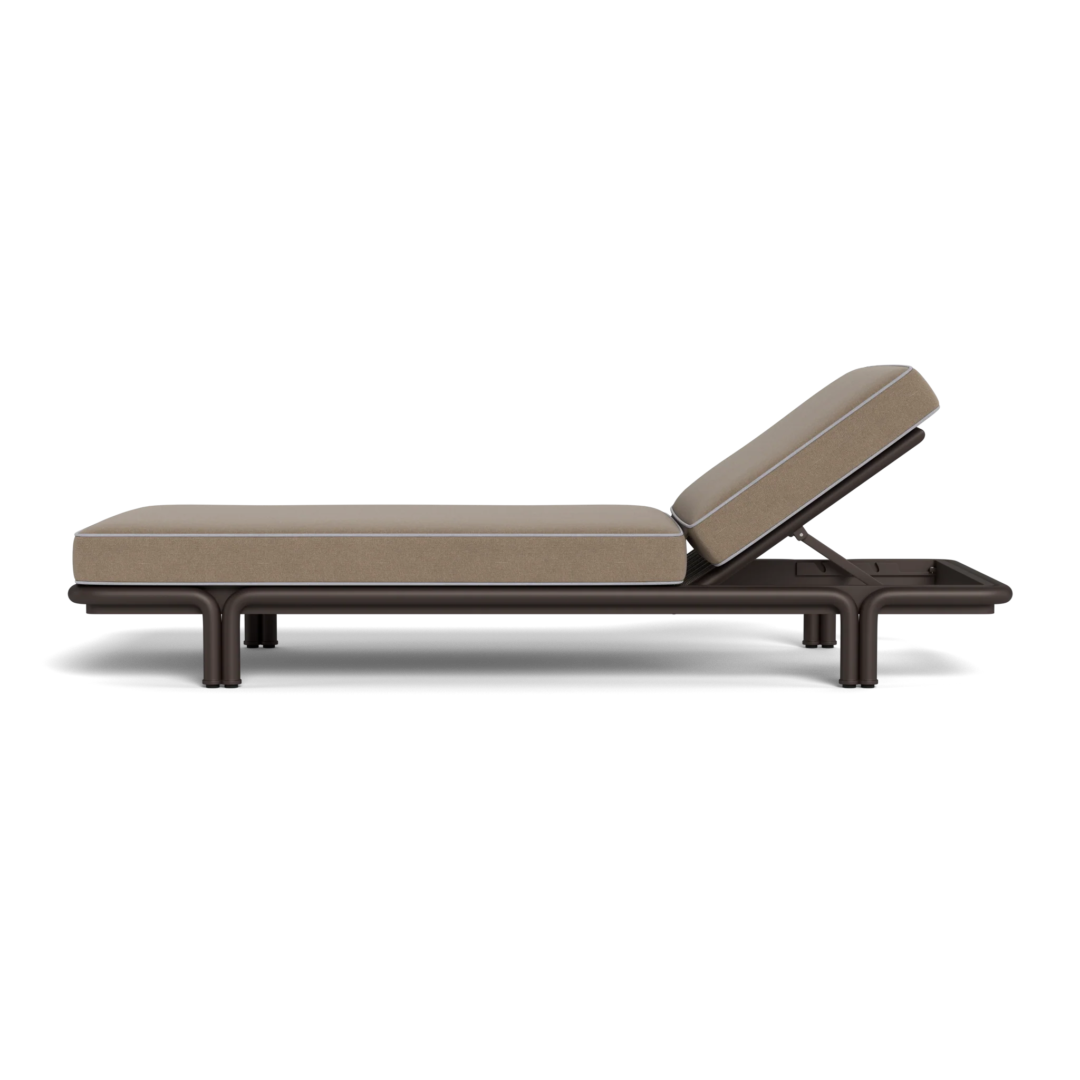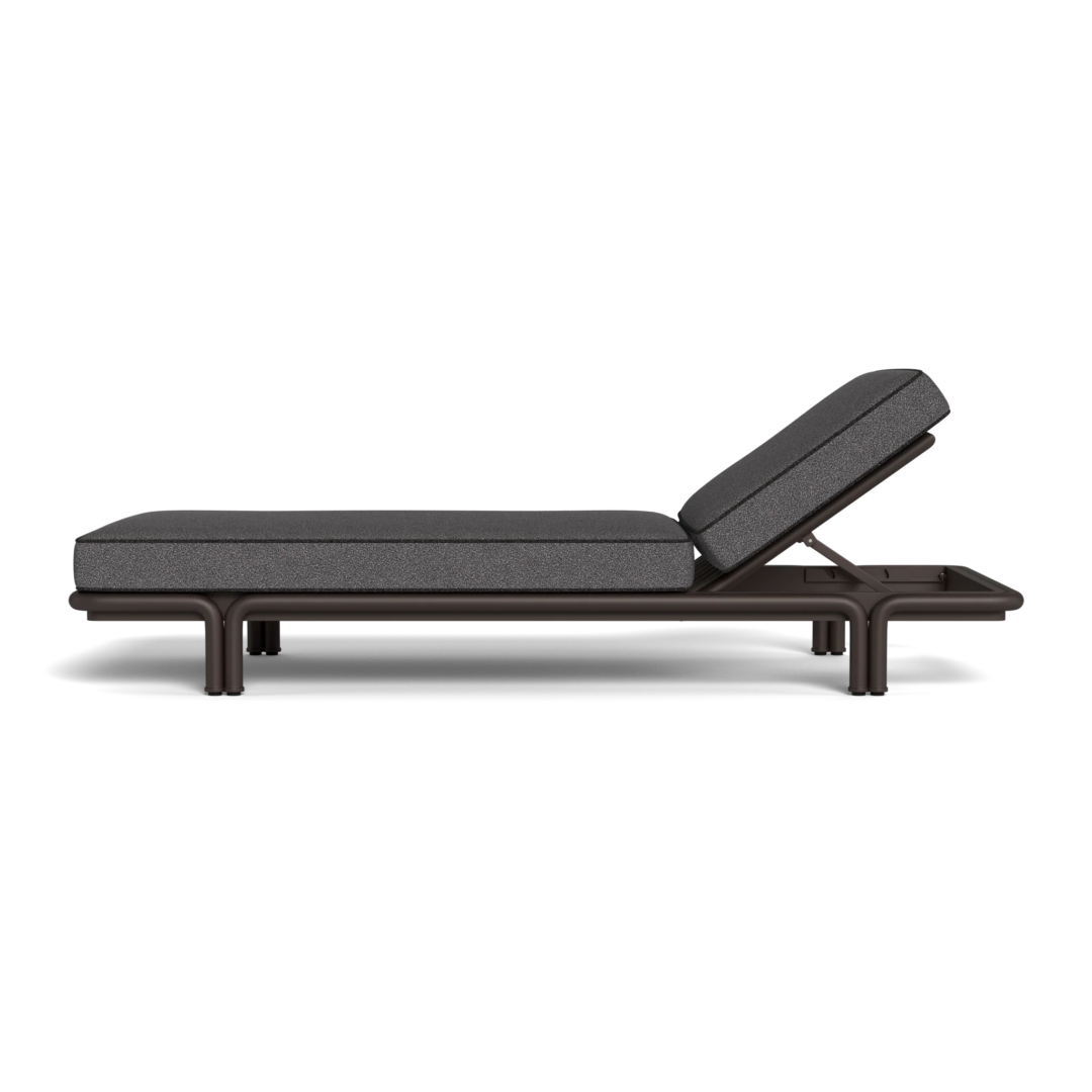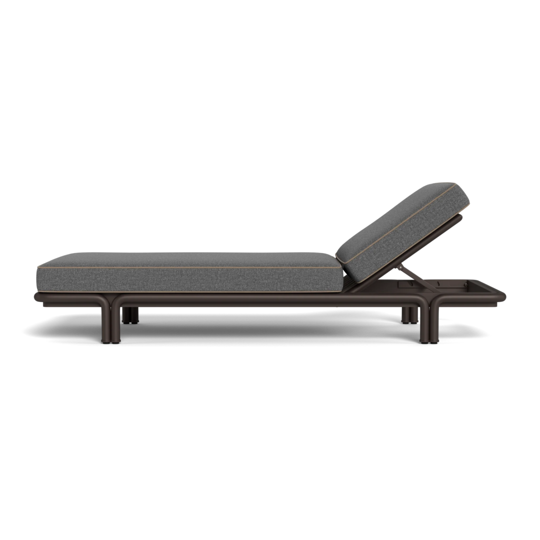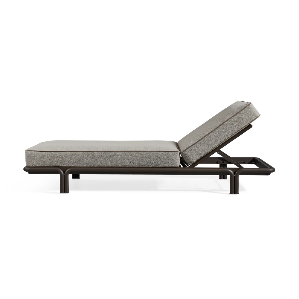 Tubular bronze aluminum, thick strapping and refined piping effortlessly update mid–century charm with contemporary sophistication for any outdoor space. The Parker Sun Lounge is a bold design statement—enjoy a comfortable hinged lounge cushion on a tubular frame with all–weather strapping, which also adds visual interest. The legs mirror the collection’s tubed details, where legs merge beautifully with backs. Details like a bolstered headrest and a subtle shape placed at the foot complete this design–forward collection. With an adjustable back for maximum relaxation, this sun lounge breathes relaxation into your outdoor space.