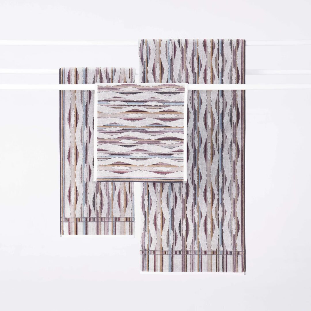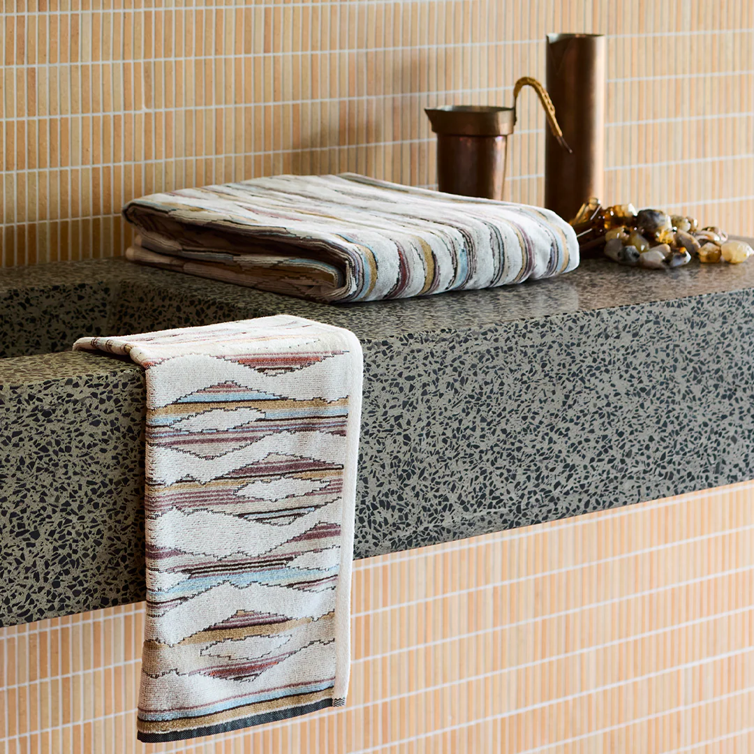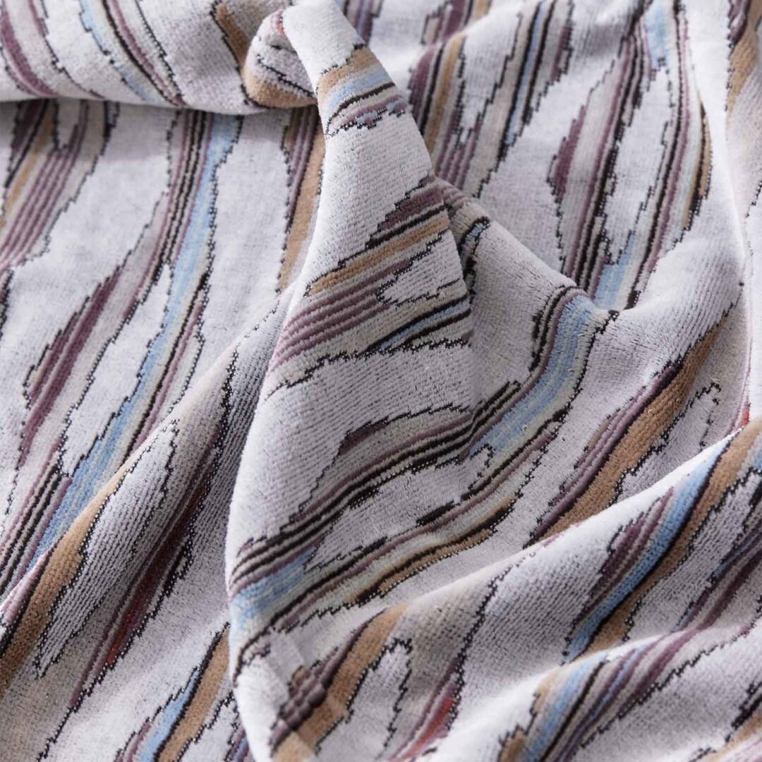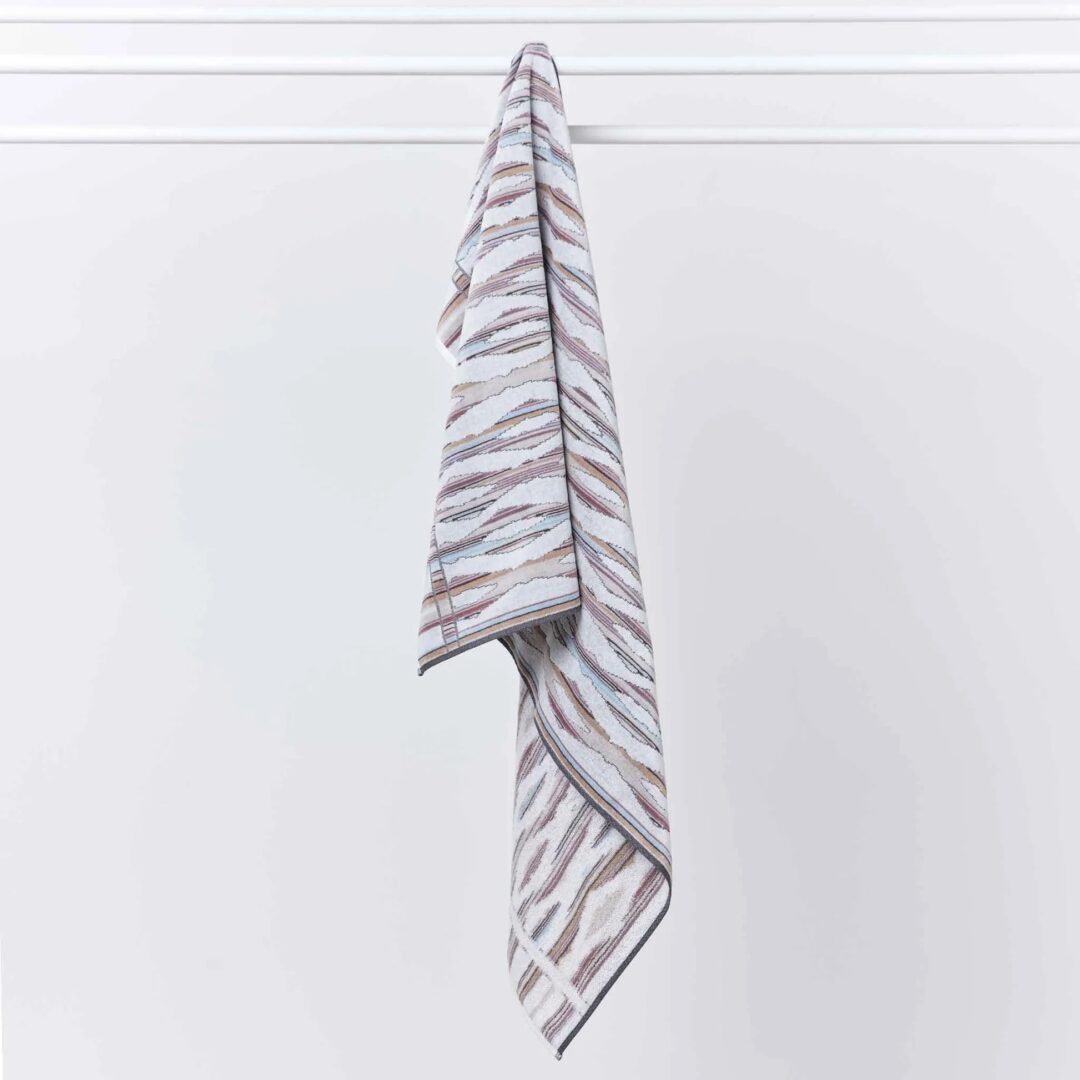 Ripple Light references the pattern of a breeze across water in the subdued soft, misty grey and white of early morning light. Woven in a luxurious combination of velour and absorbent terry finishes.