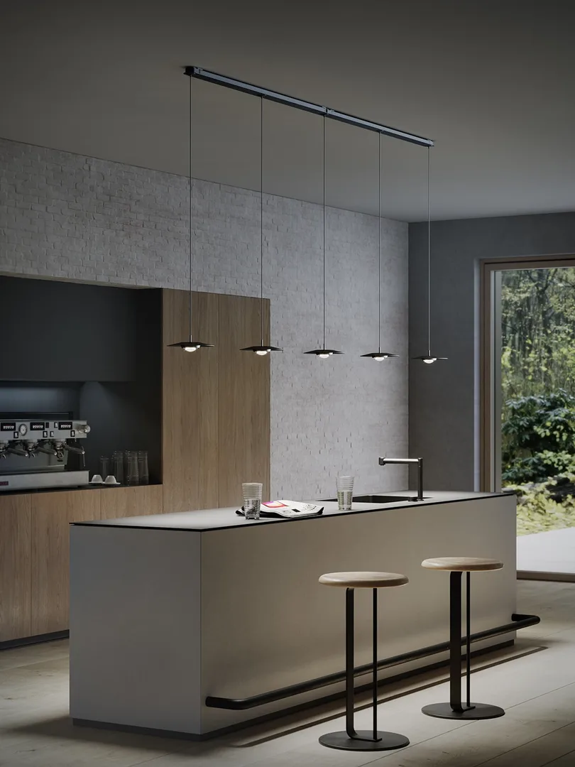 The Koinè suspension version with a reflector measuring Ø 20 cm can be installed as a single lighting point, or connected to a linear multiple plate with three descending points, each capable of hosting one luminous part.