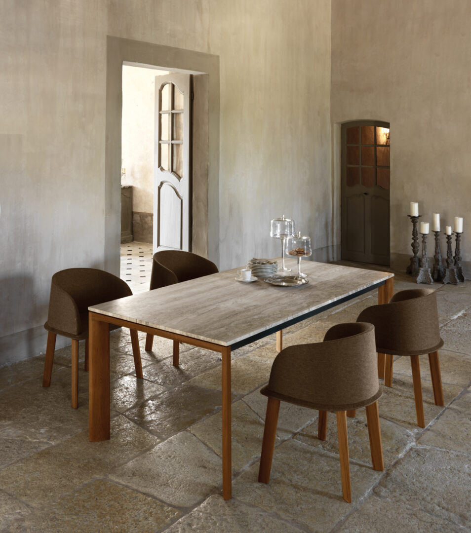 The balance between the rigid, geometrical but flexible shape of the sofa finds its counterpart in the softness of the lounge chairs. The family comprises also many other different elements that freely take part in a play between characters that shall easily and happily respond to any mood of your day.