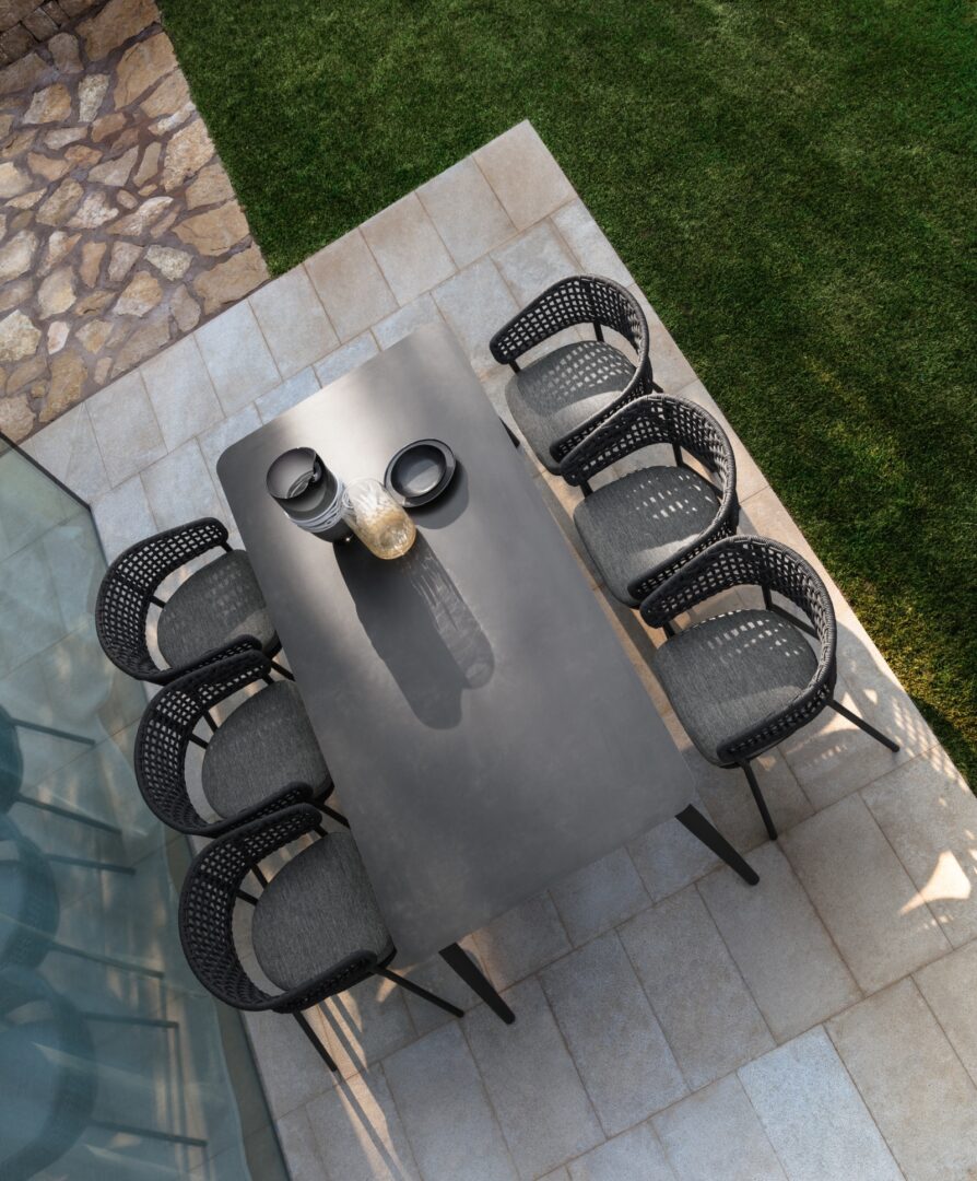 Moon Alu Dining Tables, blending practicality and timeless elegance. With an aluminum structure and ceramic top, they come in sizes 160/215×95 to 240/300×100, offering versatility. Choose from color variations in white, taupe, and graphite, redefining al fresco dining in style.